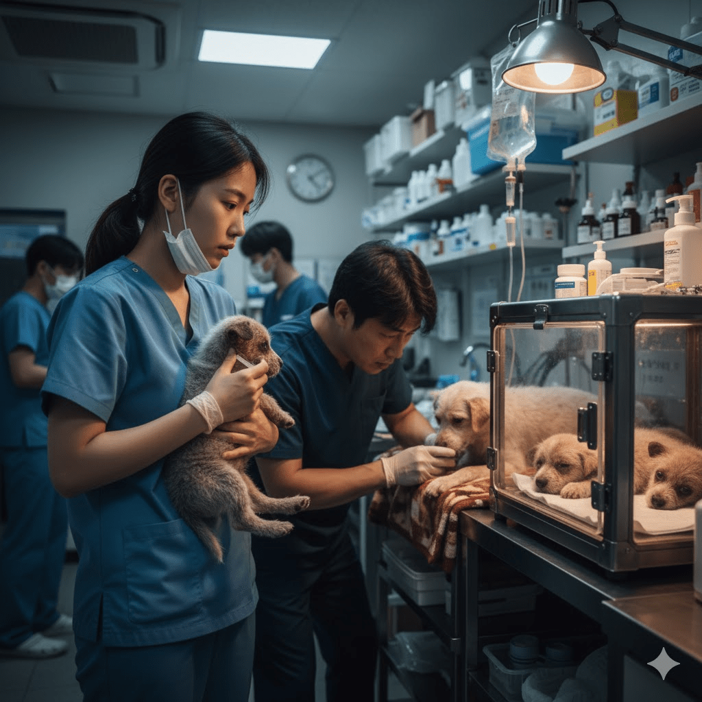 The streets of Korea, often bustling with life and vibrant energy, can also conceal stories of profound hardship. It was on one such ordinary day that a call reached Hosu uuuuuun, a dedicated non-profit animal rescue organization, reporting a heartbreaking sight: a mother dog and her two tiny puppies, cowering by a derelict building, their bodies ravaged by severe skin conditions. The scene was one of utter despair, their fur patchy and inflamed, eyes clouded with pain and fear. The image captured the stark reality of their existence – vulnerable, neglected, and seemingly without hope. The team at Hosu uuuuuun knew they had to act, but even they couldn’t anticipate the emotional rollercoaster and unexpected turns this particular rescue mission would take.