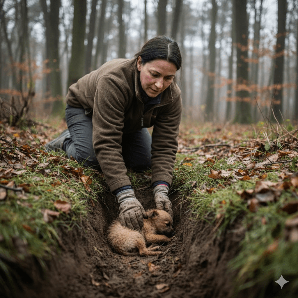 As she pushed deeper into the dense undergrowth, her eyes scanned the shadows, and that’s when she saw it – a tiny, fragile form, barely distinguishable from the fallen branches. It was a puppy, no older than a few weeks, emaciated and still, lying precariously close to a freshly dug trench, its fur matted with mud and burrs. Its small body shivered intermittently, a testament to a fading will to live. Sarah’s heart ached. This wasn’t just a rescue; it was a race against time, a desperate plea for intervention in a place where hope seemed to have long since abandoned its post. The puppy’s eyes, dull with exhaustion, held a spark of life, a silent testament to a spirit refusing to yield entirely. It was a moment that would forever change her, and the life of the small creature she was about to save.