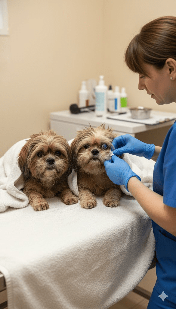 Once safely at the local animal shelter, the two Shih Tzus, affectionately named “Muddy” and “Scruffy” by their rescuers, underwent their first thorough examination. The veterinary team discovered not only severe matting that restricted their movement but also chronic ear infections, dental disease, and the significant eye injury on Scruffy. It was determined that the opaque eye was a result of a severe ulcer that had long gone untreated, leading to permanent vision loss in that eye.