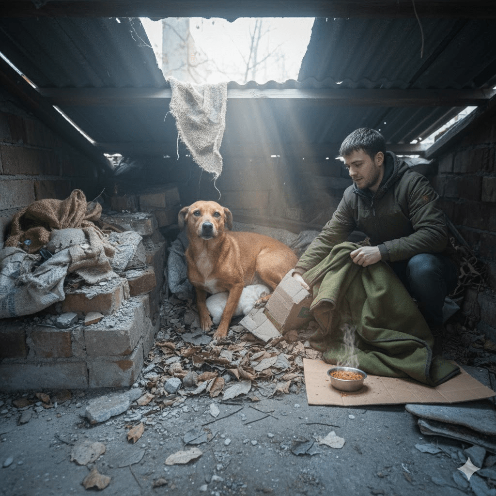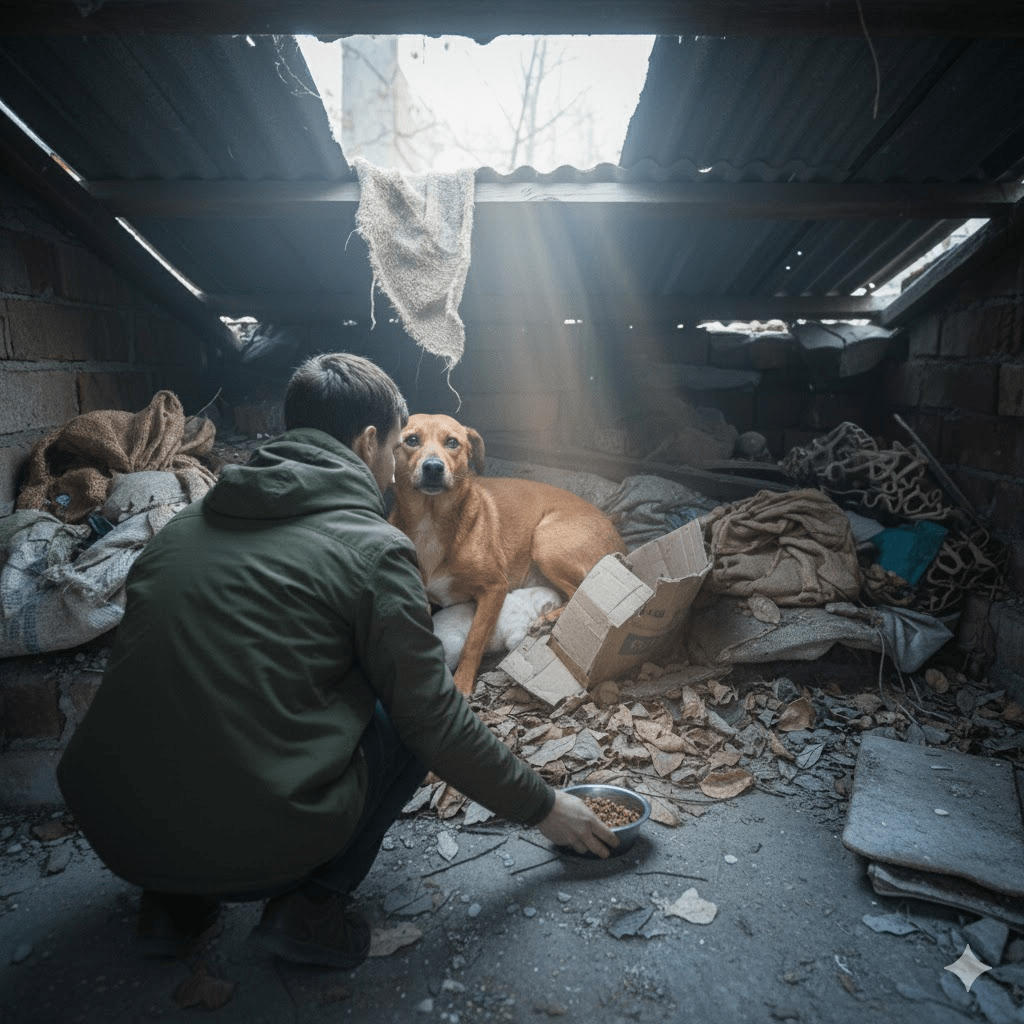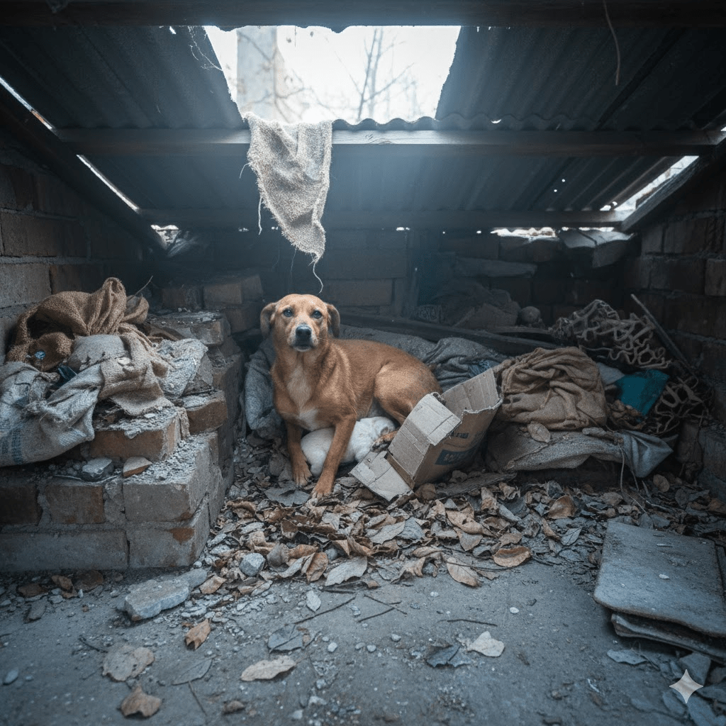 Their precarious existence was discovered by an unexpected hero, a young urban explorer named Liam, who regularly documented forgotten spaces. Liam, initially drawn by the architectural decay, stumbled upon Rusty’s hidden sanctuary, her soft whimpers cutting through the desolate silence. He saw the desperation in her eyes as she clutched the tiny, almost lifeless puppy. Pip was barely moving, frail and shivering, a stark contrast to Rusty’s fierce loyalty. Liam knew he couldn’t leave them. He retreated quietly, his heart heavy, and returned with a thermal blanket, some warm food, and a sense of urgency that transcended his usual photographic pursuits.