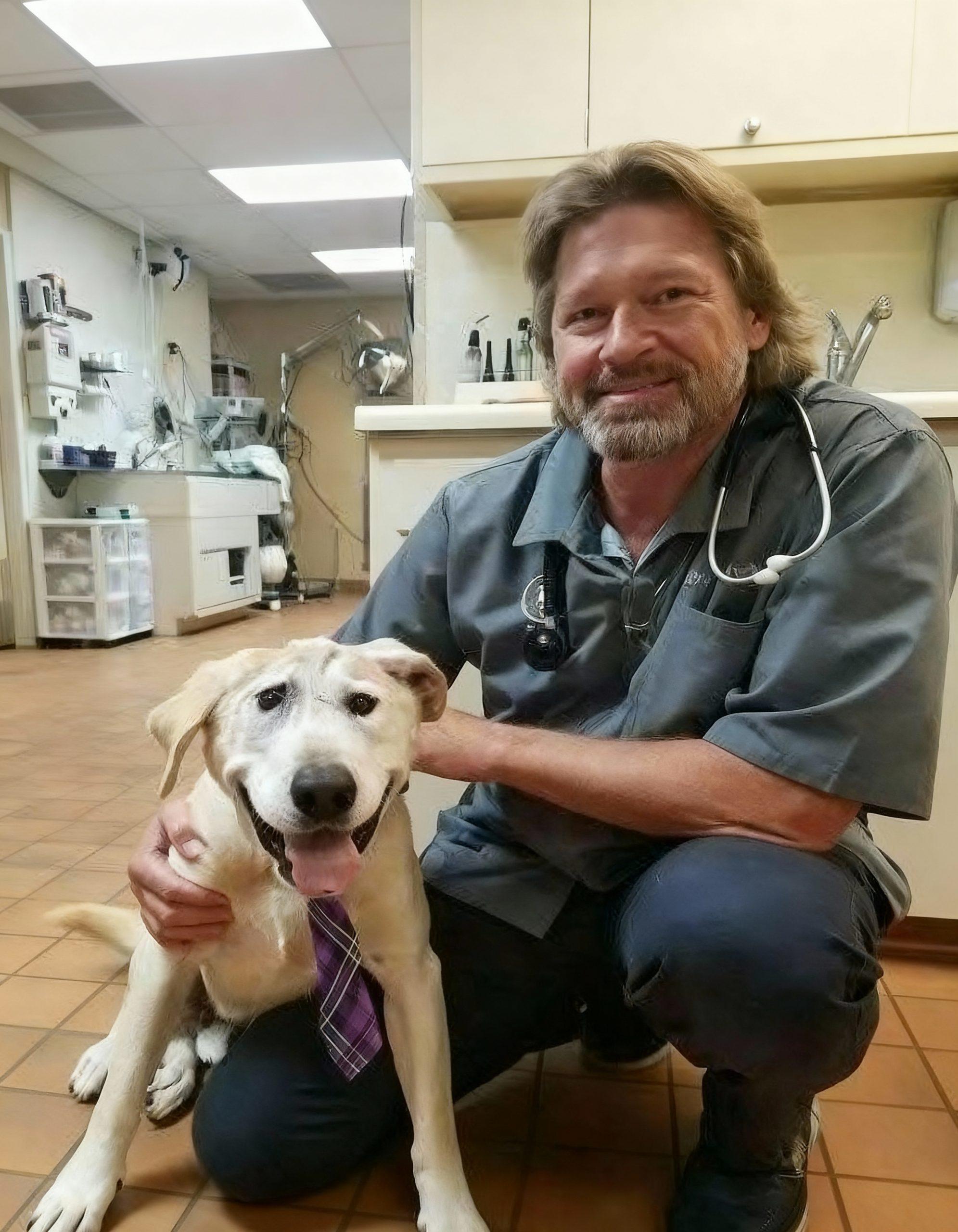 The man kneeling in the photo is Dr. Jon Phillips, a veterinarian known for treating the area’s strays pro bono when shelters run out of funds. That morning, he had agreed to examine a new intake—a matted, emaciated dog found wandering along Highway 412 with a purple plaid necktie knotted loosely around his neck, as if someone had once dressed him for a forgotten occasion. Shelter workers assumed the tie was a cruel joke left by whoever abandoned him. Dr. Phillips, however, noticed something no one else had: the tie wasn’t random. Embroidered in faded gold thread on the inside hem were the initials “M.W.” and a date—exactly eight years earlier, the very week Max had first arrived at the shelter as a two-year-old surrender.