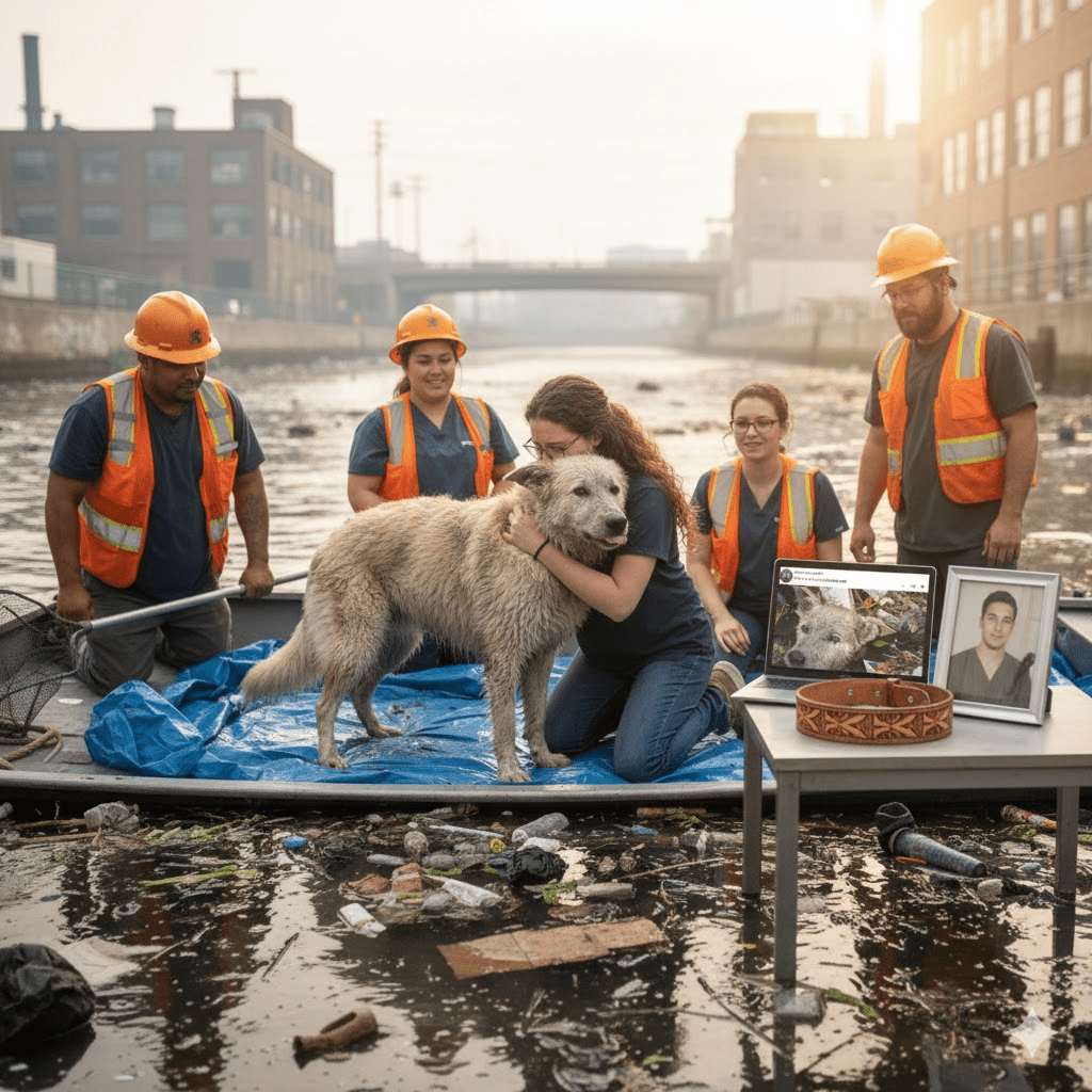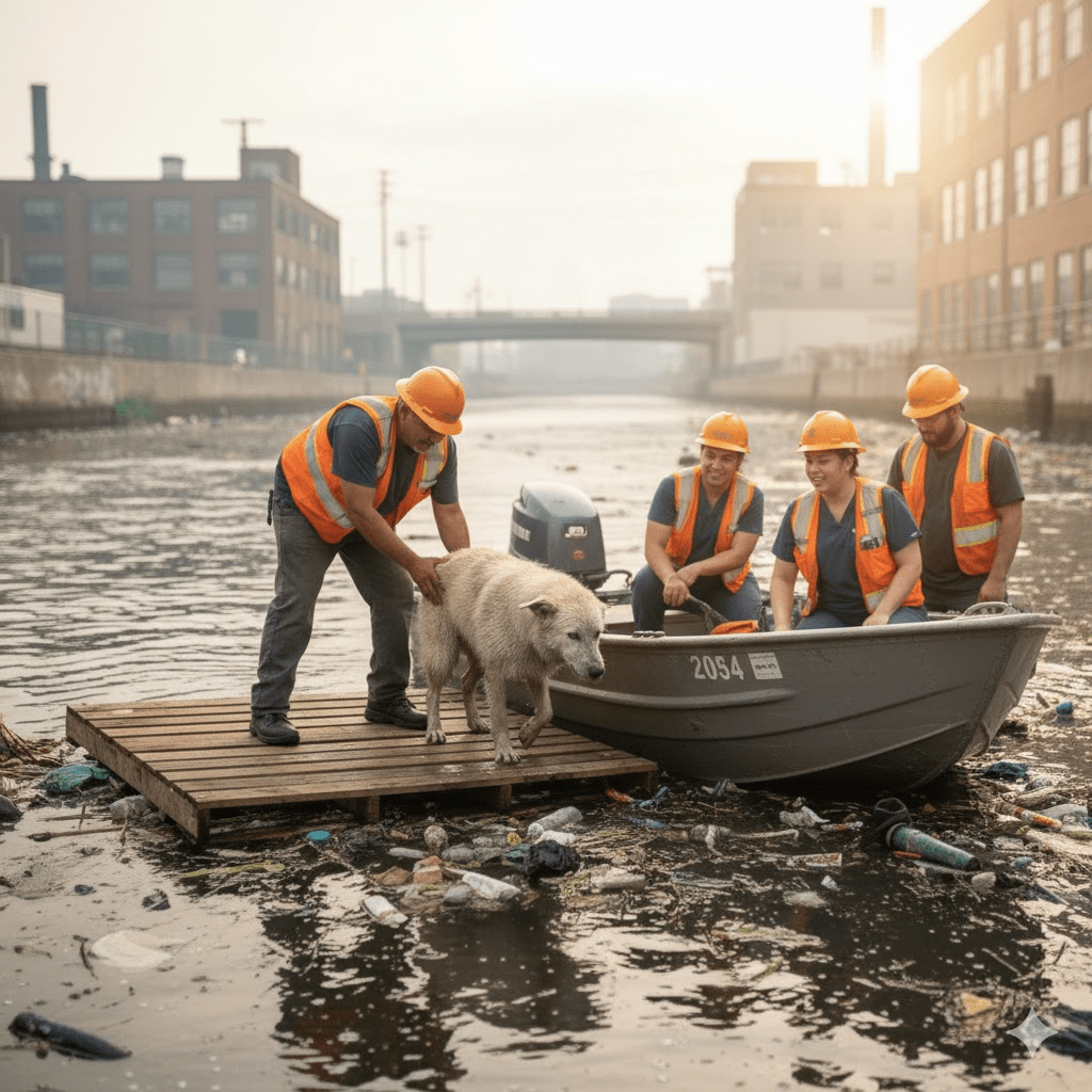 What appeared at first to be just another bag of trash slowly revealed itself to be a desperate, living creature: a dog, matted and muddy, its head barely above the waterline, trapped and silently pleading for rescue. The initial shock gave way to a collective gasp, then a flurry of concerned murmurs. This wasn’t just a cleanup operation anymore; it was a race against time and the unforgiving elements to save a life teetering on the edge. The dog, a medium-sized mixed breed, was clearly exhausted, its once vibrant coat now a dull, uniform grey from the muck. It shivered almost imperceptibly, a testament to its prolonged ordeal in the cold, polluted water. The crew, accustomed to the grim realities of their job, rarely encountered such a poignant scene. This was different. This was a direct challenge to their humanity, an urgent call to action that transcended their daily duties. The plight of this forgotten animal in a forgotten corner of the city was about to unravel into a tale far more complex and compelling than anyone could have anticipated, drawing in strangers from all walks of life and revealing the surprising resilience of both animal and human spirit.