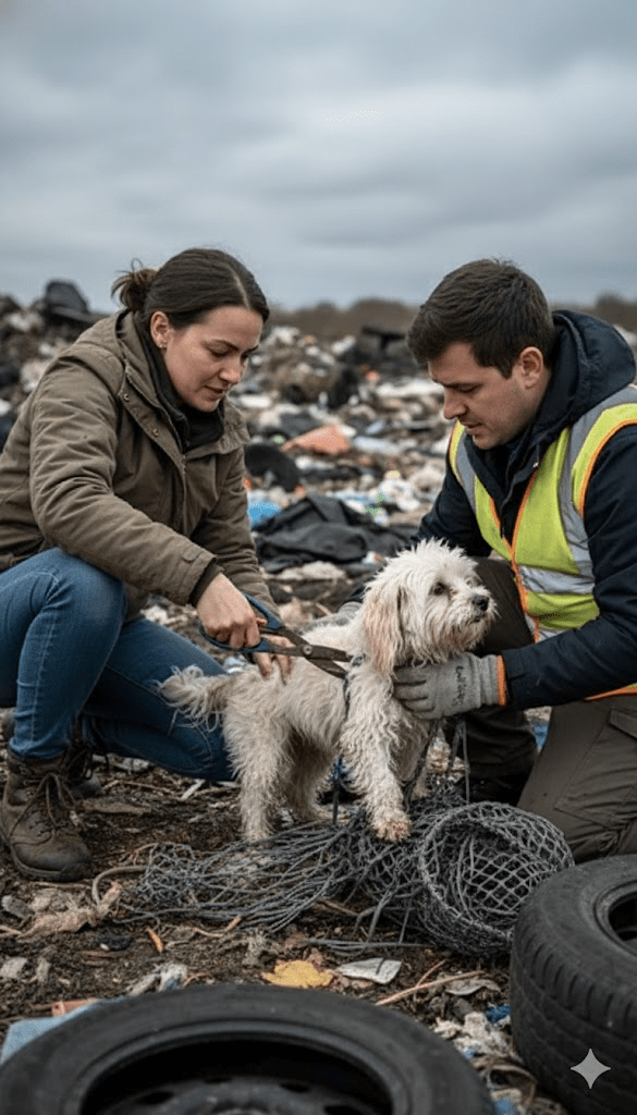 The immediate priority was to free Braveheart from his entanglement. Rescuers, working cautiously to avoid causing further distress, discovered he was not just caught in general waste but specifically in a discarded fishing net, its thin yet strong threads woven tightly around his legs and torso. The effort was painstaking, each snip of the scissors met with a low whimper from the frightened dog, yet he remained remarkably still, as if understanding that these hands, though unfamiliar, were working for his freedom.