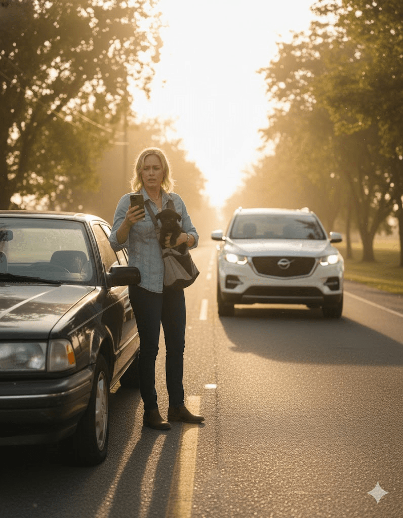 Sarah offered to take Shadow to her rescue, promising he would receive the best care. Mark, relieved, agreed. However, the unexpected twists continued. As Sarah drove Shadow to the rescue’s main contact, her car had an unexpected flat tire on a quiet rural road. Stranded, she was about to call for help when a car pulled up behind her.
