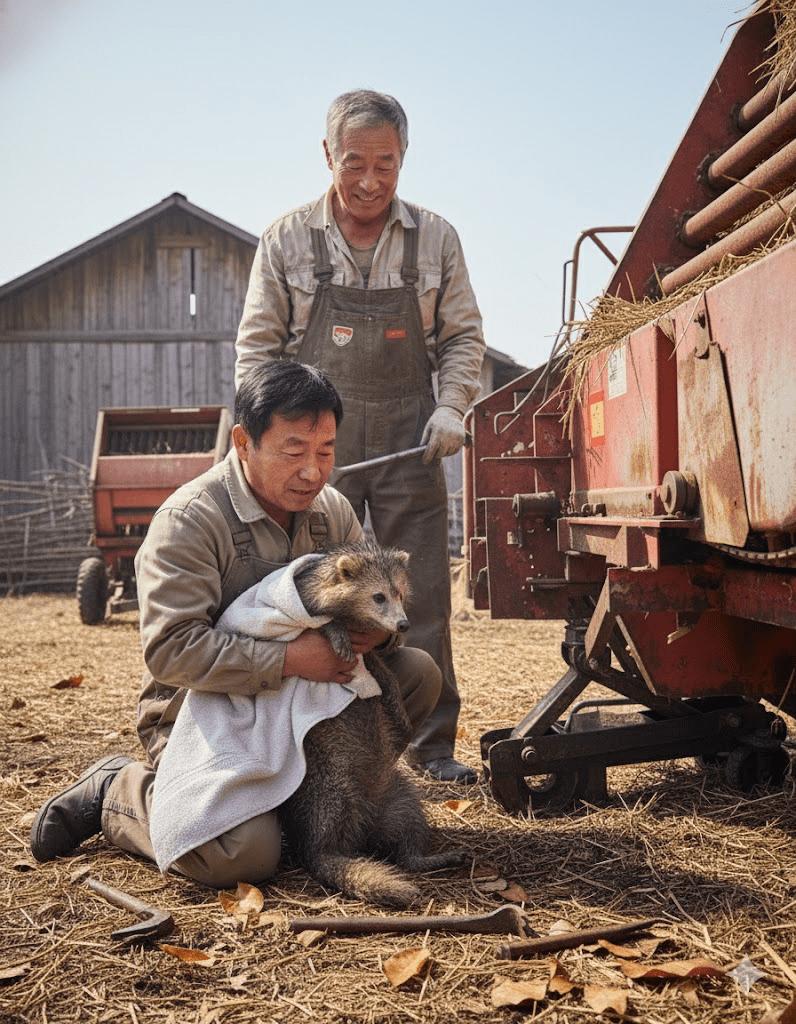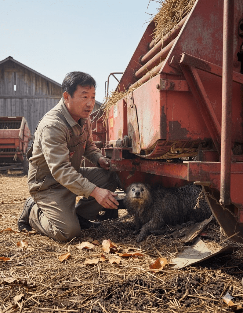 The crisp morning air usually brought with it the familiar hum of activity on Mr. Chen’s farm, but today, an unusual silence hung heavy. As he approached his old hay baler, a piece of machinery that had seen better days, a faint whimpering caught his attention. Peering closer, he discovered a sight that made his heart sink: a small, mud-caked creature, undeniably a raccoon dog, was trapped beneath the rusty contraption. Its eyes, wide with fear and exhaustion, stared out from its makeshift prison of dry hay and metal. It was clear the animal had been there for some time, likely drawn by the promise of shelter and then unable to escape the precarious position. The machine, heavy and unwieldy, pressed down just enough to pin the poor animal without crushing it entirely, leaving it in a agonizing limbo between life and death. The situation was dire, and Mr. Chen knew he had to act fast.