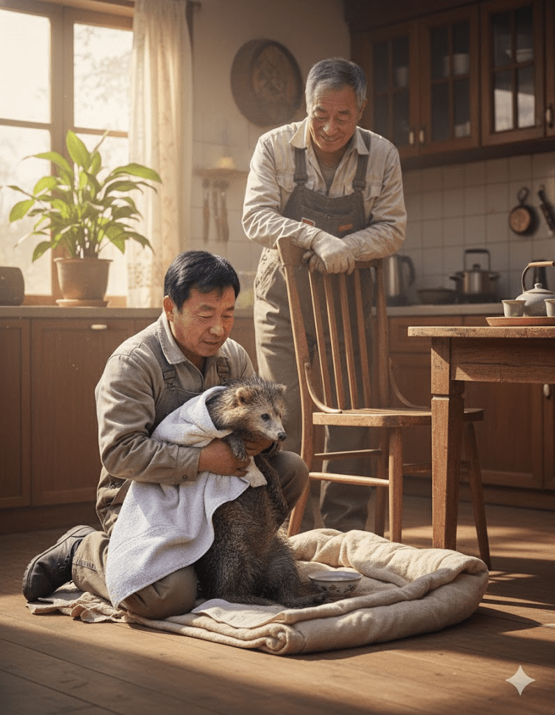 With the raccoon dog safely cradled in a soft towel, its initial wildness had given way to a profound stillness. It was severely dehydrated and covered in old mud, but to their immense relief, there were no obvious external injuries. Mr. Chen carefully carried it to his farmhouse, where he prepared a warm, quiet corner and a bowl of fresh water. The little creature lapped greedily, its energy slowly returning.