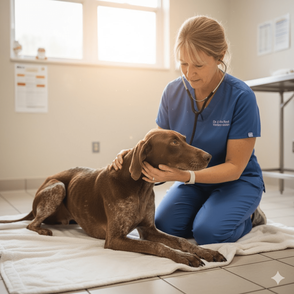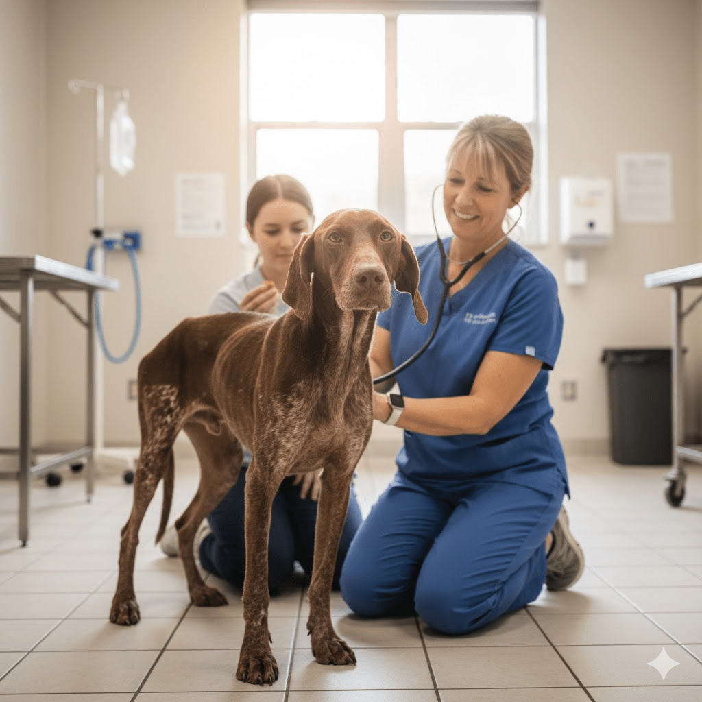 The desolate image of a dog, gaunt and weary, its ribs starkly visible beneath a patchy coat, tells a story of profound suffering. This was the initial devastating reality for a young German Shorthaired Pointer mix named “Rusty” by the shelter staff, who found him on the verge of collapse.