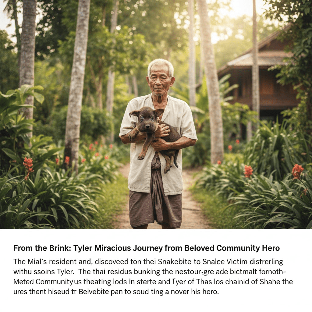 Days turned into weeks, and against all odds, the puppy, now named Tyler, slowly began to recover. The initial recovery was fraught with setbacks. Tyler, though no longer in immediate danger from the venom, developed a severe infection at the bite site, requiring constant care and further improvised treatments. Somchai, a humble farmer, poured all his meager resources into nursing the little dog back to health, sacrificing his own comforts for Tyler’s well-being. He even sought advice from an elderly village healer, who provided traditional remedies and words of wisdom, guiding him through the pup’s recovery. The community, initially skeptical, watched with growing admiration as Somchai tirelessly dedicated himself to Tyler. They saw not just a man caring for an animal, but a testament to profound empathy in the face of adversity. Tyler’s unique appearance, a lasting mark from the bite, became a symbol of his struggle and survival, endearing him further to the villagers.