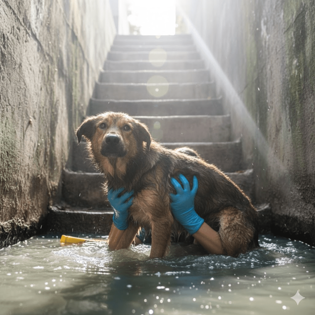 The image before you captures a moment of stark vulnerability – a solitary dog, partially submerged in murky water, eyes wide with a mixture of fear and quiet resignation. This is Hopper, a name now synonymous with an extraordinary journey of survival, resilience, and the power of unwavering determination. His story began not in a cozy home, but in the desolate confines of a sewage drain, a place where life rarely thrives. Rescued from this grim predicament, he carried not just the grime of his ordeal, but the heavy burden of a suspected spinal injury, a diagnosis that could have easily sealed his fate. Yet, Hopper, an unsung hero in fur, refused to be defined by his circumstances. What followed was a battle fought with every ounce of his spirit, a testament to the indomitable will to live that resonated with everyone who crossed his path.