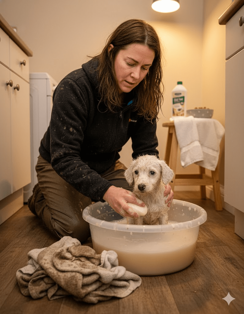 Sarah, carefully scooping up the shivering pup, rushed it home, her mind racing with thoughts of warmth, food, and a much-needed bath. The task of cleaning the mud-caked fur revealed an even more distressing reality: the puppy was severely emaciated and covered in fleas. Despite its weakened state, a spark of resilience flickered in its eyes. After a gentle bath and a small meal, the puppy, whom Sarah affectionately named “Hope,” began to show signs of life, wagging its tiny tail in gratitude.