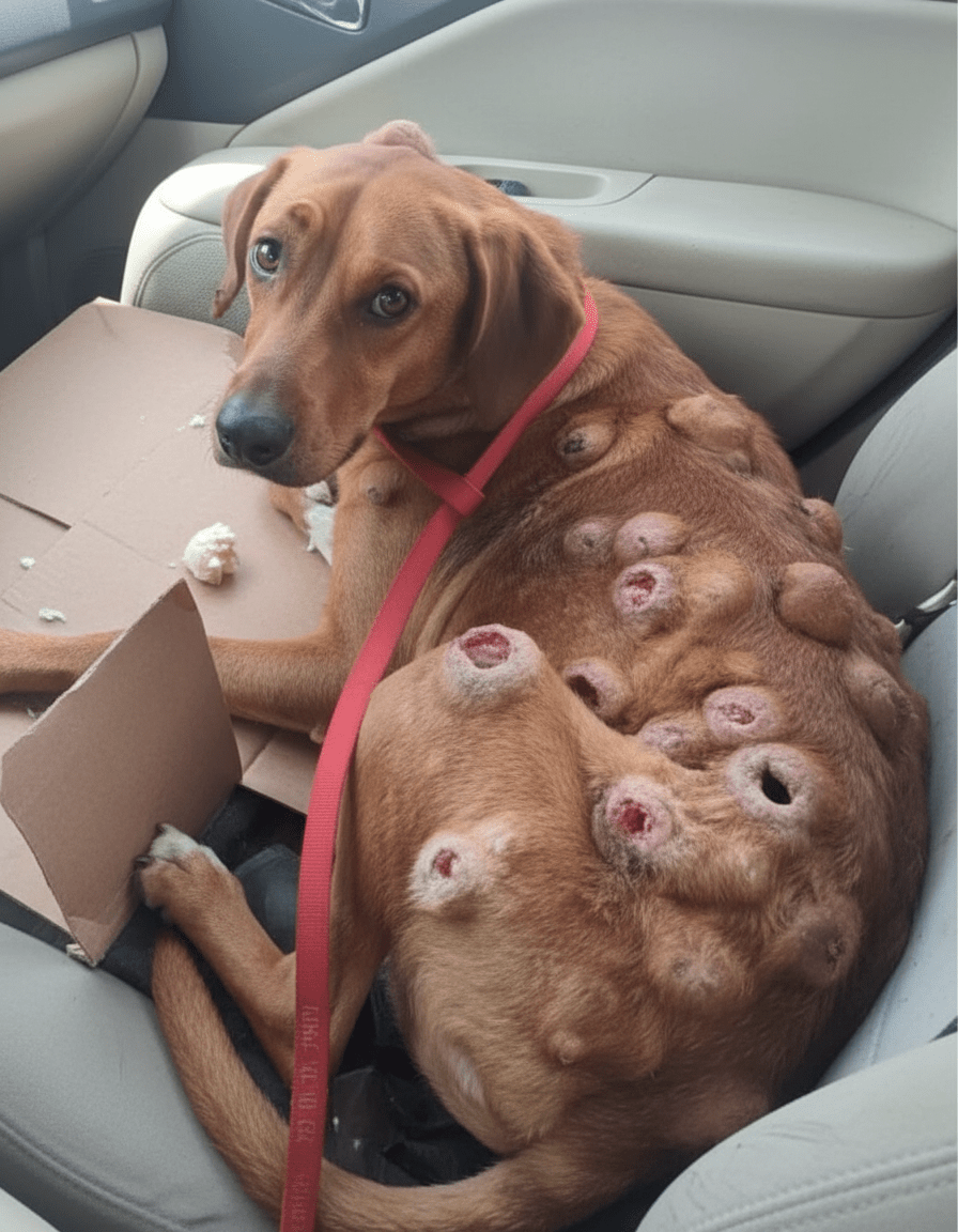 In the fading light of a crisp autumn afternoon in rural Tennessee, a gaunt, golden-brown hound-mix lay curled on the cracked asphalt of a seldom-used service road just outside the small town of McMinnville. His once-glossy coat was matted with dirt and blood, and his body was grotesquely distorted by more than a dozen softball-sized tumors that protruded from his neck, shoulders, flanks, and hindquarters like grotesque fruit on a dying vine. A frayed red leash—clearly not his own—was knotted loosely around his neck, its other end trailing uselessly onto the ground. The dog’s amber eyes, clouded with pain and exhaustion, followed the occasional passing car with a mixture of hope and resignation. No one stopped. For three days, local residents had seen him there, too afraid of the tumors, too convinced he was beyond help. Then, on the fourth day, a silver pickup truck slowed, pulled onto the shoulder, and a woman named Evelyn Harper stepped out with a blanket and a thermos of warm broth. What unfolded over the next eight months would become a story whispered in veterinary clinics from Nashville to Knoxville, shared on social media across the Southeast, and eventually picked up by animal-welfare networks as far away as Canada and the UK—a testament to what happens when compassion collides with crisis