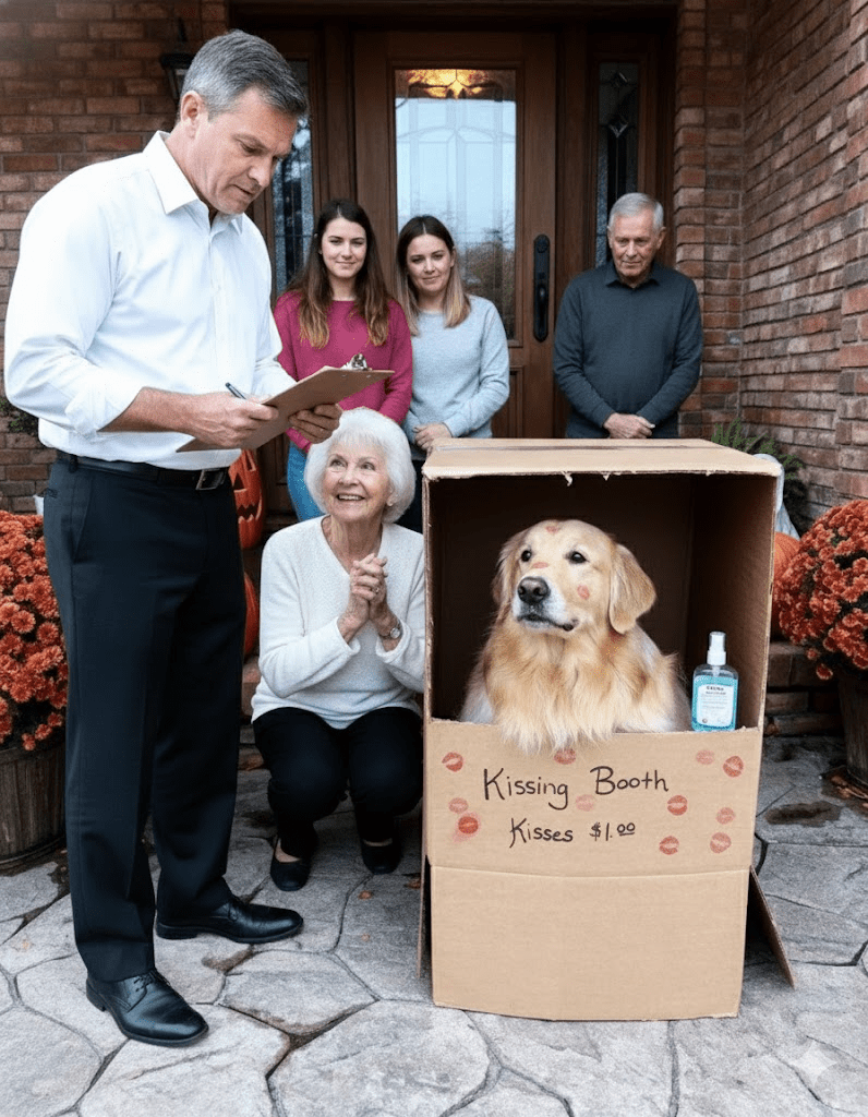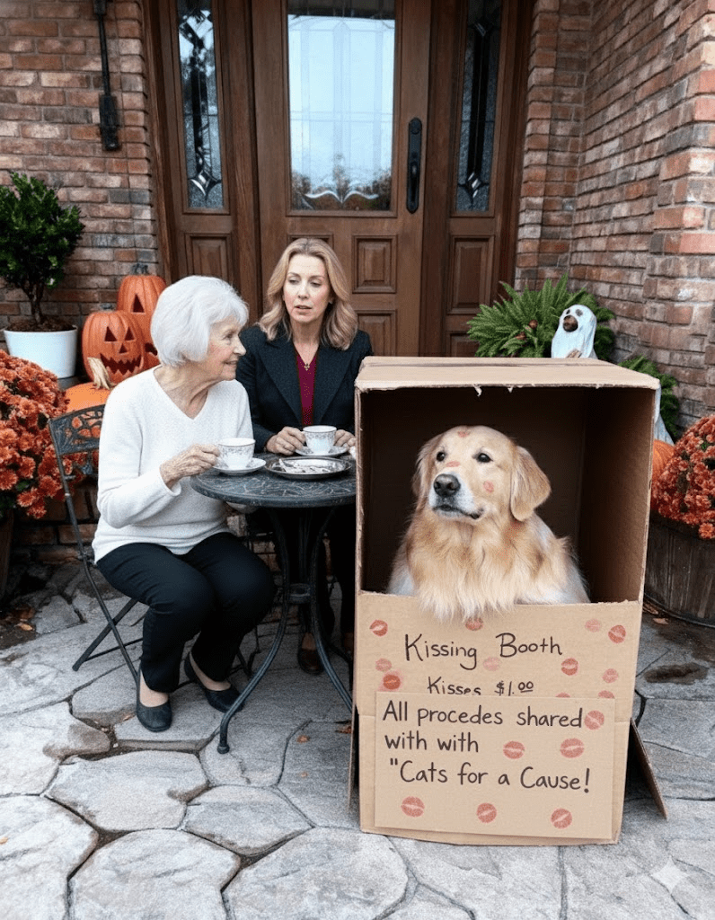 In a charming suburb known for its vibrant community spirit and annual pet parade, an unexpected event unfolded that would capture the hearts and attention of residents far and wide. It began innocently enough, with a cardboard box, a marker, and an undeniably charismatic golden retriever named Buddy. His owner, Mrs. Gable, a retired art teacher with a penchant for whimsical creativity, had set up a “Kissing Booth” on her front porch, complete with a sign advertising “Kisses $1.00.” What started as a lighthearted attempt to amuse trick-or-treaters during the Halloween season quickly transformed into something far more profound, sparking both local debate and heartwarming displays of generosity. The initial trickle of curious children and amused adults soon became a steady stream, drawn in by Buddy’s soulful eyes and the undeniable charm of the setup. Little did anyone know, this simple booth was about to become the epicenter of a delightful, albeit slightly chaotic, neighborhood phenomenon.