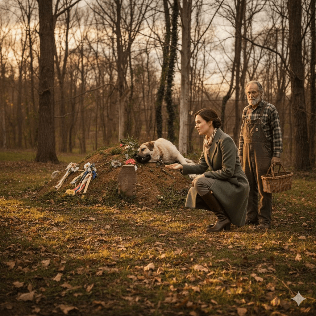 Weeks turned into months, and Max’s unwavering devotion became a local legend. Children from the town would leave treats and toys near the grave, whispers of “Sarah’s dog” echoing through the trees. Elias visited daily, bringing food and fresh water, always hoping Max would finally relent. Yet, one crisp autumn afternoon, a stranger appeared at the grave. She wasn’t from Willow Creek, her city clothes a stark contrast to the rustic surroundings. As she knelt beside Max, she spoke in hushed tones, her voice unfamiliar, but the dog responded with a soft whimper, nudging his head into her outstretched hand. Elias, watching from a distance, felt a pang of surprise; Max had never shown such immediate comfort to anyone but Sarah.