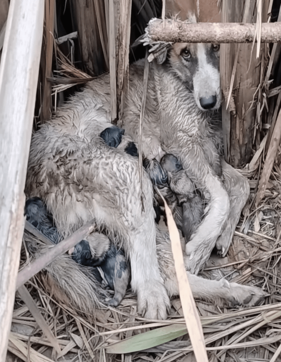Emily’s discovery began innocently enough. As she navigated a narrow footpath flanked by sheep fields, the rain-slicked ground gave way to a steep embankment where an old Victorian-era drainage system, installed over a century ago to manage floodwaters from the nearby River Ure, had partially collapsed. The culvert, a forgotten relic of industrial ingenuity, was clogged with decades of silt, plastic waste from upstream farms, and now, tragically, a family of stray dogs. The mother, a medium-sized border collie mix with matted fur streaked in shades of gray and white, had somehow slipped into the narrow space while foraging for food amid the floods. Her six newborn puppies, no more than a week old, blind and helpless with their eyes still sealed shut, were huddled against her in a makeshift nest of soggy newspaper and twigs. The water level was rising rapidly—fed by the overflowing river—and the mother dog, whom Emily would later name Luna, was frantically licking her pups to keep them warm while pawing at the metal grate that barred any escape. One puppy had already tumbled into a deeper puddle, its tiny form submerged up to its neck, and Luna’s exhausted barks were growing weaker by the minute.