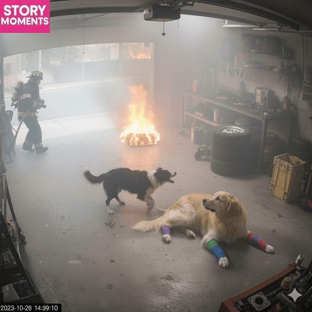 In a quiet suburban garage, what began as a routine day for a homeowner quickly escalated into a heart-stopping drama of smoke, flames, and astonishing canine bravery. The air, usually filled with the scent of motor oil and sawdust, became thick with an acrid haze, signalling a hidden danger. As the fire alarm blared, piercing the afternoon calm, a Golden Retriever named Sunny, known for his placid demeanour, lay unusually still, his legs wrapped in colourful therapeutic bandages—a recent injury making him immobile. Beside him, Daisy, a quick-witted Border Collie, sensed the shift in the atmosphere long before the smoke detector shrieked. Her eyes, usually bright with mischief, now darted around, picking up on the faint, unsettling scent of combustion. It was a smell that humans might dismiss at first, but to Daisy, it was an urgent warning, a primal call to action that would soon define the extraordinary events that followed. This was no ordinary fire; it was a test of loyalty and an unfolding emergency that would reveal the incredible bond between a dog, her injured friend, and the unexpected arrival of a hero.