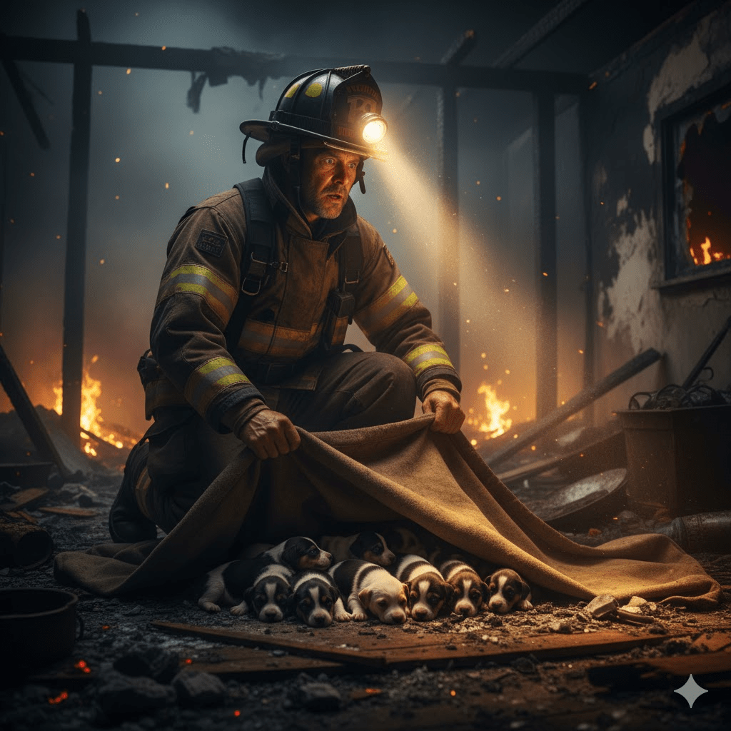 With his last ounce of strength, Daniel burst out into the smoky yard, the precious bundle of lives safe in his arms. As he collapsed onto the grass, the hiss of his empty oxygen tank was the final sound before silence. He had saved the puppies, but in doing so, he had made the ultimate sacrifice. The raw grief that swept through Fire Station 14 was profound, yet it was quickly tempered by the miraculous survival of the ten tiny creatures.
