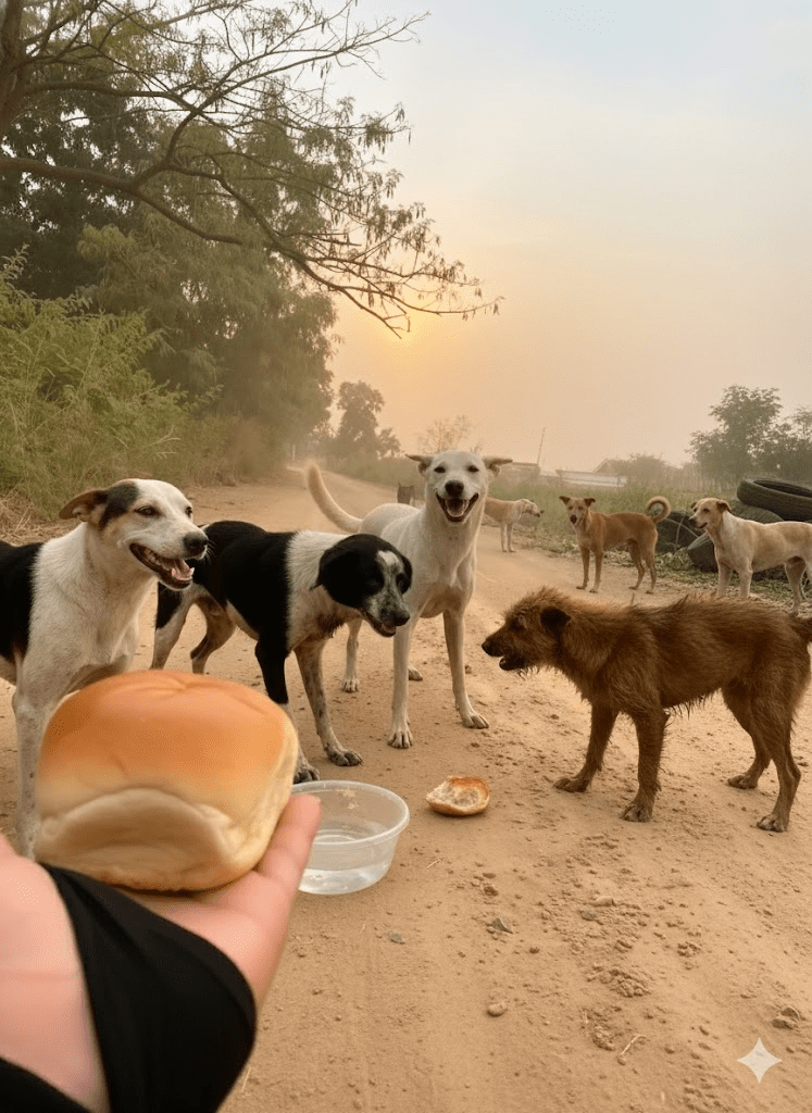 Alex quickly realized his single bread roll wouldn’t be enough. He watched as the brown, scruffy dog in the foreground, with its wild, untamed fur, moved closer, its eyes fixed intently on the offering. The black and white dog to the left, which had been among the first, now stood tall and alert, its tail giving a tentative wag. In the background, a line of other dogs had formed, their postures varying from cautious anticipation to hopeful expectation. The scene was no longer just about sharing food; it was about witnessing the quiet social dynamics of a street dog community, their unspoken rules and shared understanding. Alex felt a pang of guilt for not having more to offer, but also a growing sense of connection to these resilient creatures.