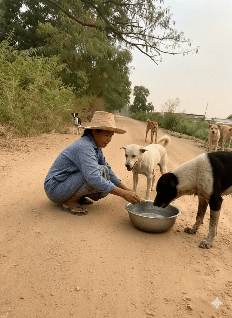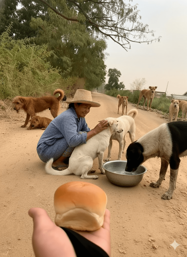 Just as Alex began to feel overwhelmed by the sheer number of hungry eyes, a new figure appeared down the road. It was an elderly woman, her face weathered by the sun, wearing a traditional straw hat. She carried a large metal bowl and a plastic jug of water, her movements slow and deliberate. She knelt by the side of the road, filling the bowl with water, and the dogs, as if on cue, shifted their focus from Alex’s diminishing bread to her. It was a surprising twist; Alex had expected competition, but instead, he witnessed a quiet symbiosis, a recognition of another regular benefactor. The white dog, which had been so exuberant with Alex, now approached the woman with a gentle deference, indicating a long-standing, trusting relationship.