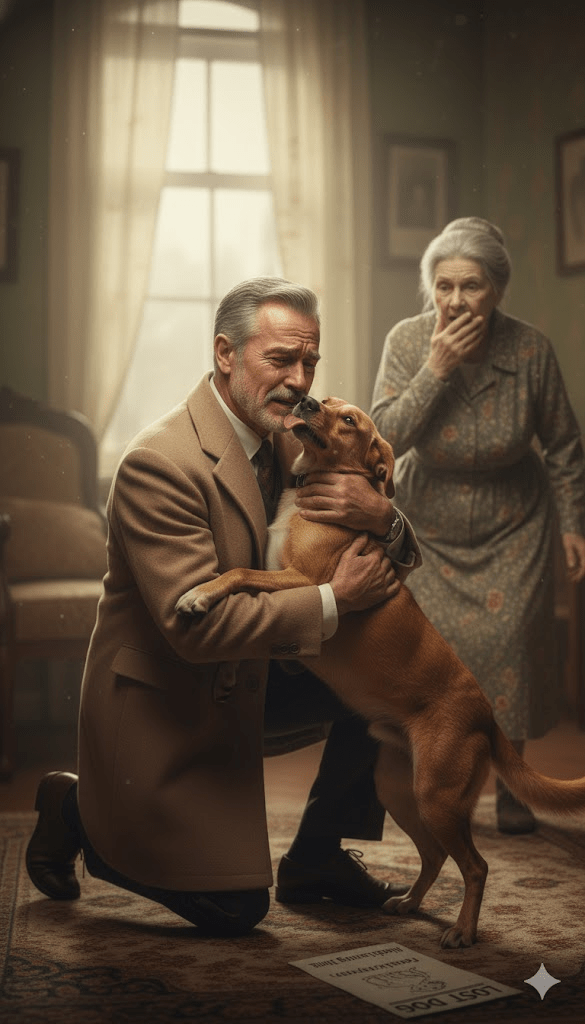 Then, a most astonishing twist occurred. A wealthy philanthropist, Mr. Harrison, known for his charitable work and animal welfare advocacy, saw one of the flyers. Intrigued by the earnest description of Rusty and the plea for help, he visited Mrs. Petrov’s apartment. He was deeply moved by Rusty’s gentle nature and the palpable bond he shared with Mrs. Petrov. Even more surprisingly, he recognized Rusty. The dog was, in fact, “Barkley,” his own beloved pet who had gone missing months ago after a traumatic incident during a storm. Mr. Harrison had offered a substantial reward for his return, which had gone unclaimed until now.
