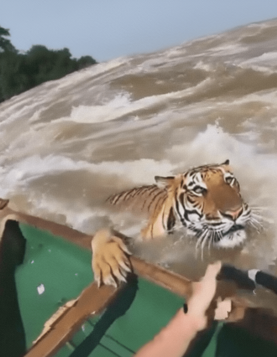 What happened next defied every wildlife protocol. As Reeves drew parallel, the tiger veered sharply, forepaws clawing the kayak’s slick polyethylene hull. The impact rocked the boat 30 degrees; Reeves counterbalanced instinctively, dropping his paddle and grabbing the carry loops. For 47 seconds—timed by the GoPro—the tiger clung to the kayak’s stern, its 200-kilogram weight pushing the bow skyward. Water poured over the deck, but the kayak’s buoyancy held. The animal’s claws left four parallel gouges, each 8 centimeters long, but never once did it turn its head toward Reeves. “He was using me as a raft,” Reeves said. “His eyes stayed fixed on the opposite shore, ears flat, breathing like a steam engine.”