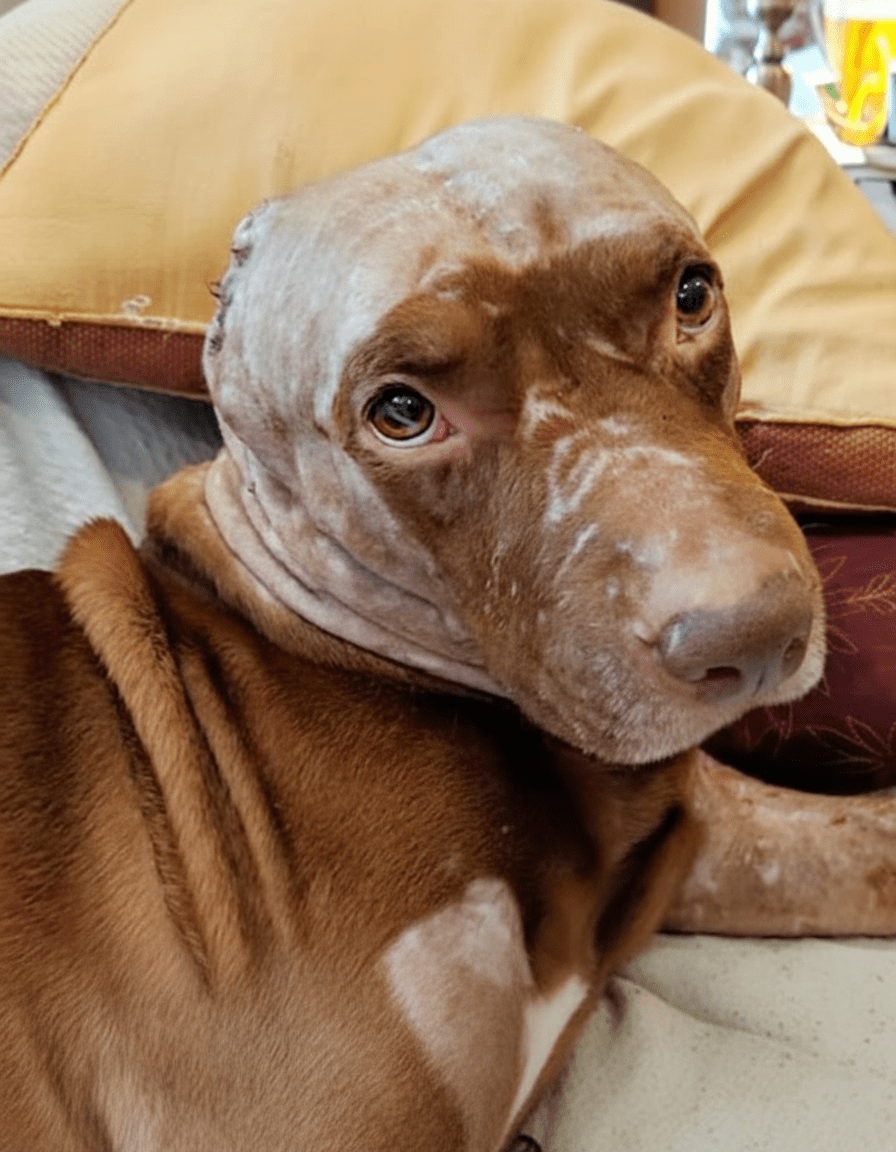 Months turned into a year, and Legend’s physical transformation was nothing short of miraculous. His head, once a raw landscape of wounds, was now covered in surprisingly smooth, albeit hairless, skin. His once sunken eyes sparkled with vitality, and he had regained a healthy weight. He moved with a newfound confidence, his tail wagging often, a stark contrast to the trembling, broken creature he once was. Yet, the psychological scars ran deeper. Loud noises still made him flinch, and he remained wary of sudden movements. His caregivers understood that while his body had healed, his mind needed time and patient reassurance. He began a specialized rehabilitation program, incorporating gentle play, positive reinforcement training, and quiet, consistent human interaction to rebuild his trust. His progress, though slow, was steady and deeply moving to witness.