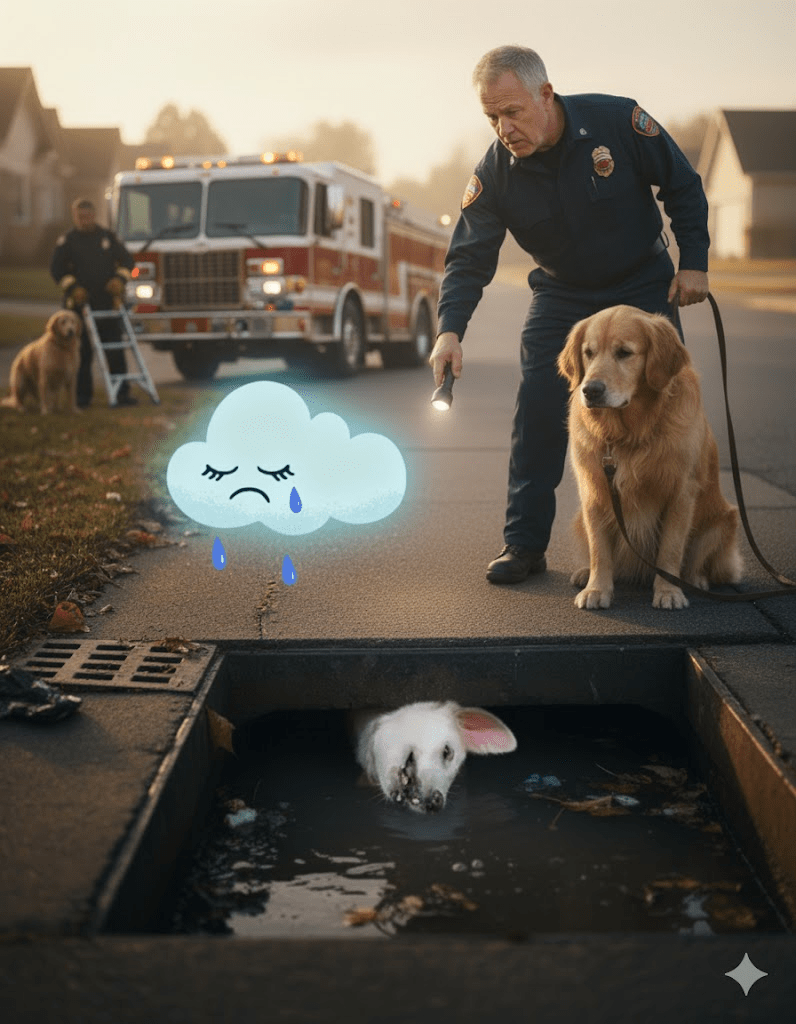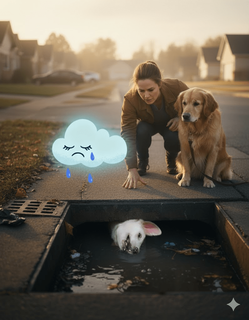 The quiet afternoon in the suburban town of Meadowbrook was shattered by a faint, persistent whimpering. It was a sound that tugged at the heartstrings, emanating from an unlikely source – the storm drain on Elm Street. Local resident Sarah Jenkins, walking her own dog, paused, her brow furrowed in concern. As she knelt, peering into the grimy depths, her breath hitched. There, wedged in the narrow confines of the drain, was a tiny, white puppy, its eyes wide with fear and its little body trembling. A dark, cartoon-like cloud, heavy with tears, seemed to hover above its head, a poignant visual representation of its distress. The sight was heartbreaking, a stark reminder of the hidden dangers that lurk even in the most familiar urban landscapes. How did it get there? How long had it been trapped? A knot of worry tightened in Sarah’s stomach. She knew she couldn’t leave the helpless creature to its fate. This was just the beginning of a dramatic rescue operation that would test the resolve of an entire community and unveil unexpected acts of kindness.