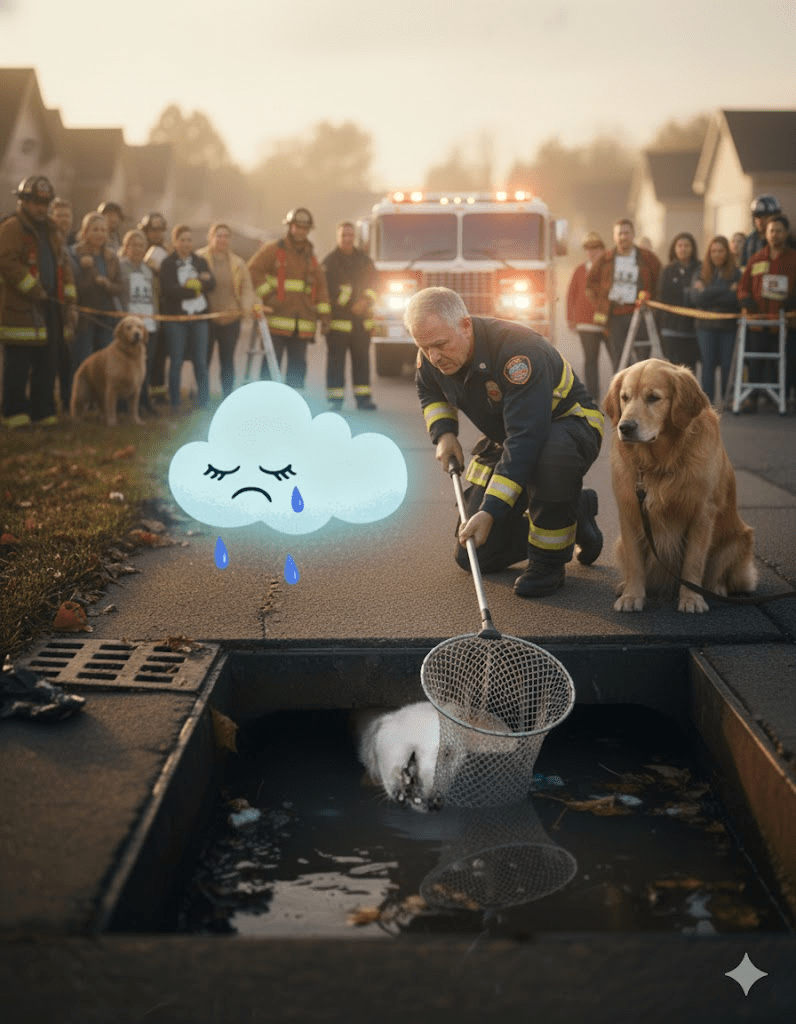 Upon arrival, the firefighters quickly assessed the situation. The puppy was indeed stuck, its small head barely above the water level in the drain. A crowd had gathered, drawn by the commotion and the heartbreaking whimpers. The firemen attempted several methods to extract the puppy, using poles and nets, but the drain’s narrow opening and the puppy’s fear made it impossible. The “sad cloud” above the puppy seemed to intensify, its tears falling faster.
