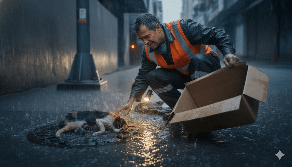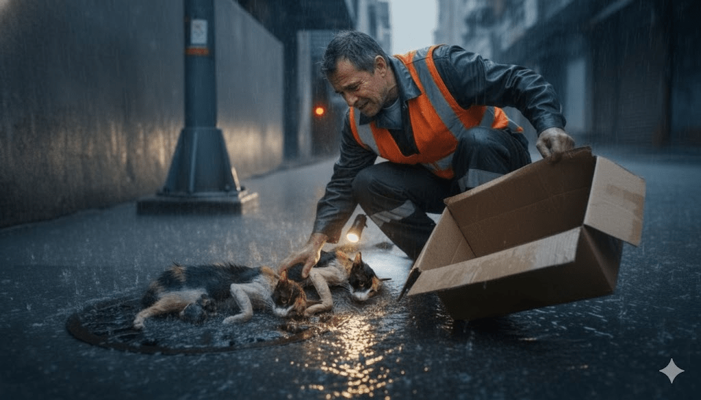 It was then that a city sanitation worker, on his routine patrol, spotted the small, bedraggled huddle by the curb. Miguel, a man accustomed to the gritty realities of urban life, initially thought it was just discarded debris. But as he drew closer, the faint mewling sounds pierced through the drone of the rain. His heart sank as he recognized the desperate tableau: a mama cat, clearly exhausted and soaked to the bone, with several tiny kittens barely visible beneath her. The scene was gut-wrenching, a raw display of vulnerability that cut through the mundane tasks of his day. He knew he couldn’t just drive past; this was an emergency far beyond his usual duties.