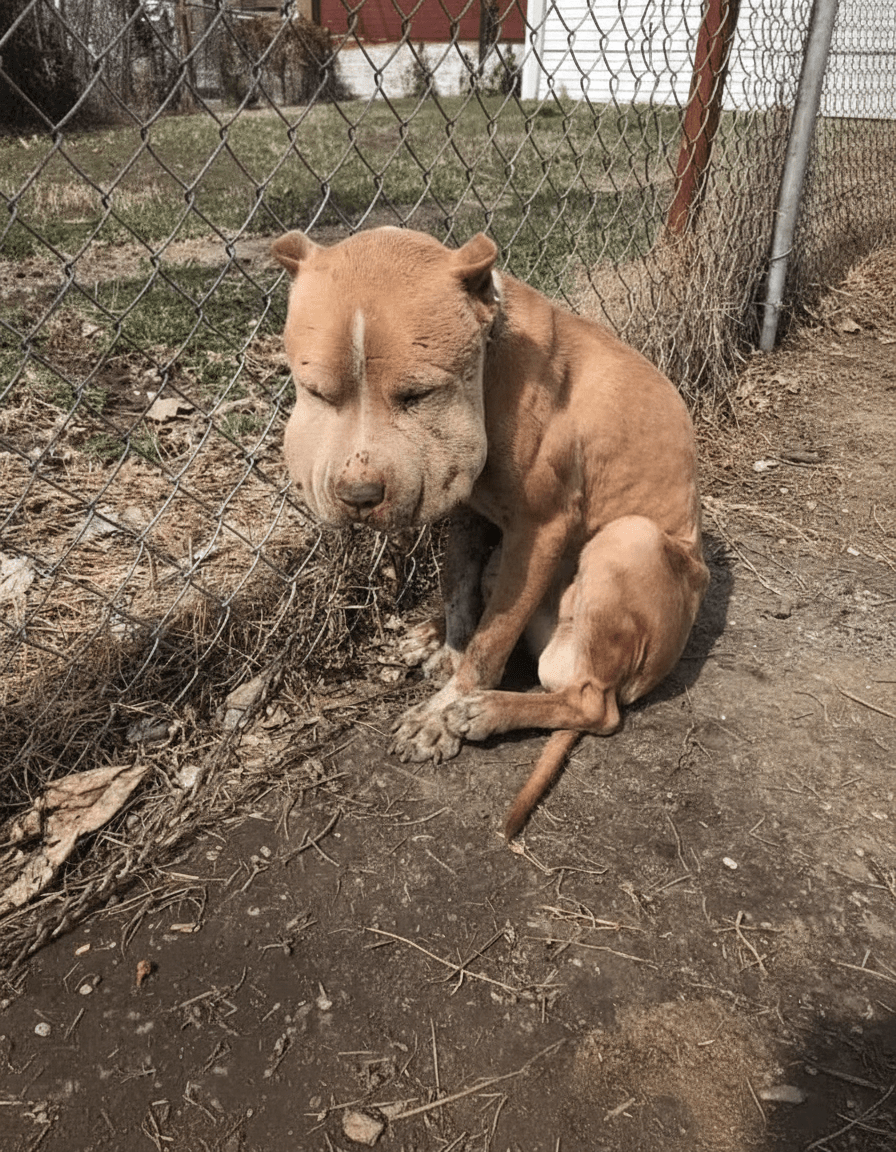 In the frostbitten outskirts of Detroit, Michigan, on a gray November morning in 2019, a single photograph shattered the indifference of thousands. It showed a stocky red-nose pit bull pressed against a rusted chain-link fence, his head grotesquely swollen to twice its normal size, eyes reduced to pained slits, and a thick marine rope cinched so tightly around his throat that the skin beneath had begun to ulcerate. The dog—later named Marco by the rescuer who refused to look away—sat motionless on the cracked concrete slab that served as his world, shivering not from the cold but from systemic infection and blood loss. Behind him stood a boarded-up duplex with peeling crimson paint, its windows sealed with plywood scrawled with faded gang tags. No food bowl, no water, no shelter from the wind that whipped through t