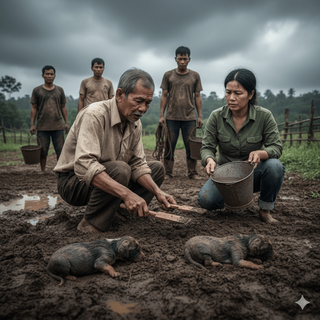 Reaching the puppies, they faced another unexpected challenge. The mud around the tiny animals was not just deep; it was surprisingly dense, almost like wet concrete, refusing to yield easily. Digging too aggressively could injure the fragile creatures. A more delicate approach was needed. Maria, known for her gentle touch and patience, carefully began to scoop away the mud using her bare hands, feeling for the small bodies underneath. The others formed a human chain, passing small buckets of water to loosen the surrounding earth and carefully removing the loosened sludge. The tension was palpable; every movement was slow, deliberate, and fraught with the fear of causing more harm.