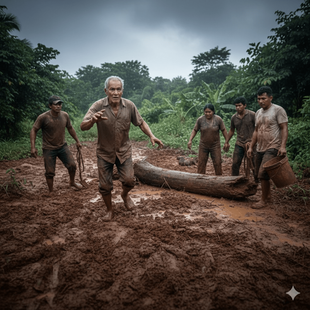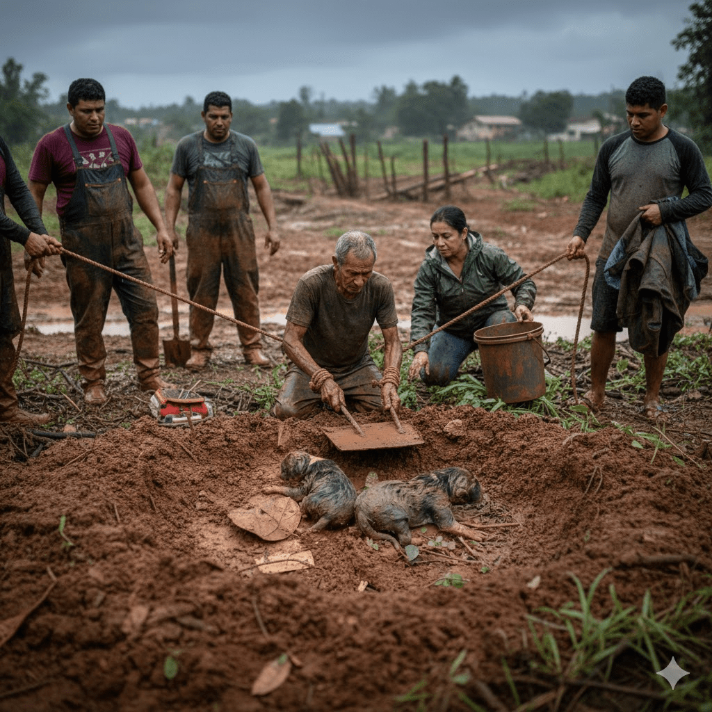Suddenly, a new problem arose. As they carefully excavated around one of the puppies, the ground beneath it, destabilized by their efforts, began to shift. A collective gasp went through the group. The puppy, which they were just beginning to free, started to sink even deeper. “Hold still, everyone!” Mateo commanded, his voice strained but firm. Juan quickly threw a rope towards the sinking area, creating a temporary anchor point, while others carefully pushed solid debris – small logs and flat stones – under the shifting mud to prevent further collapse. It was a perilous dance between saving and destabilizing, a moment where a wrong move could have devastating consequences.