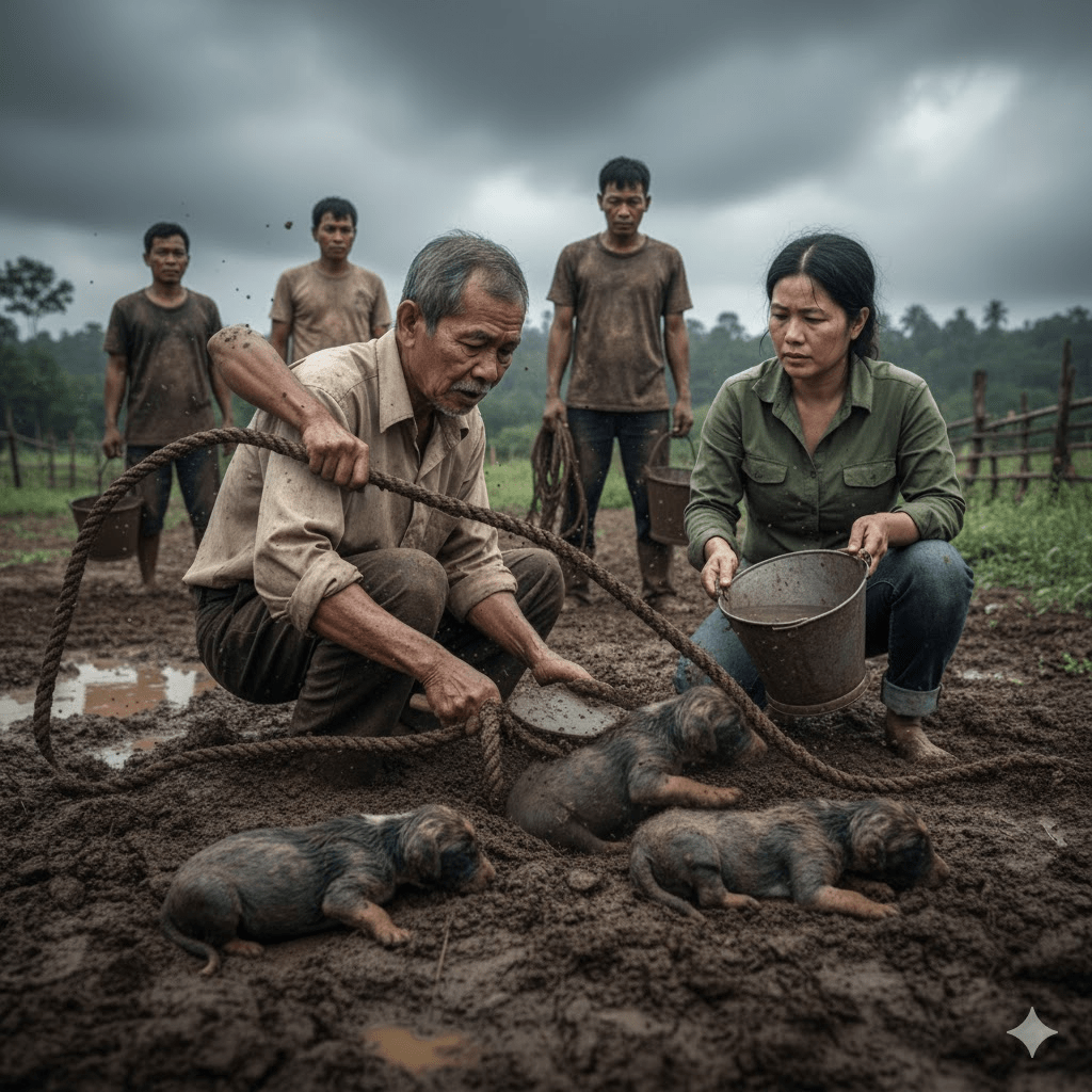 Within minutes, a small but determined group had assembled, armed with shovels, ropes, and a shared sense of urgency. The path to the trapped puppies was arduous. The ground, still saturated, threatened to pull them under with every step. Juan, a younger, stronger man known for his quick thinking, devised a makeshift plank system using discarded wooden boards to distribute their weight, preventing them from sinking deeper. Each step was carefully measured, each movement a calculated risk. The air was thick with the scent of damp earth and sweat, and the only sounds were the squelch of boots in the mud and the collective grunts of effort. The sun, attempting to break through the overcast sky, cast an eerie, diffused light, making the scene feel even more surreal.