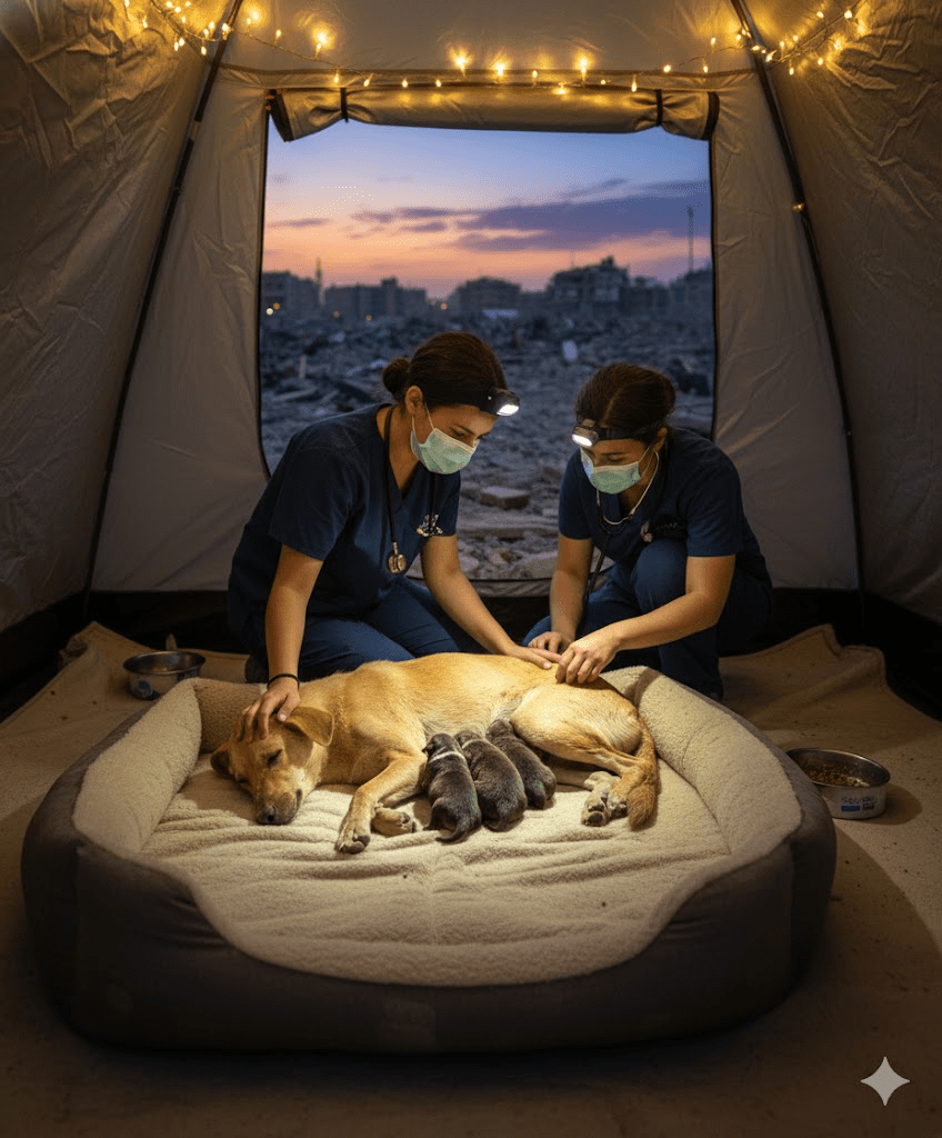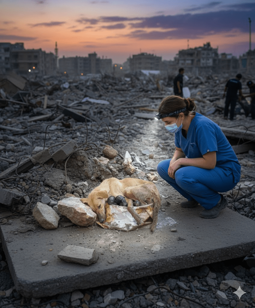 In the quiet desolation of what was once a bustling neighborhood, reduced to a skeletal remains by an unforeseen calamity, a profound testament to life’s enduring spirit unfolded. Amidst the precariously balanced rubble and the ghost of shattered homes, a faint whimper cut through the silence, a tiny tremor in the vast aftermath. It was the sound of new life, fragile and insistent, cradled precariously against the worn, dust-caked body of a mother dog. She lay motionless, a sentinel of resilience, her eyes barely open, but radiating an ancient, fierce protectiveness over the three tiny, squirming bundles nestled close to her belly. The scene was stark, a tableau of survival painted in shades of ochre and grey, a poignant contrast between overwhelming destruction and the quiet, miraculous act of birth. This was no ordinary event; it was a beacon of hope, a whisper of continuity in a world turned upside down.