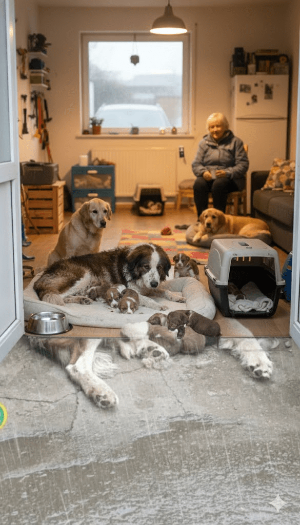 In the quiet outskirts of a forgotten industrial town, where rusting factories loomed like skeletal giants and cracked sidewalks whispered of better days, a sudden downpour transformed the world into a gray, unforgiving blur. On the evening of November 6, 2025, as thunder cracked overhead and rain hammered relentlessly, a lone stray dog—her fur matted with mud and exhaustion—collapsed onto the cold concrete landing of an abandoned stairwell. She was not alone. Tucked beneath her trembling body were four newborn puppies, barely hours old, their tiny forms pressed desperately against her warmth. The stairwell, half-shielded by a crumbling overhang, offered scant protection from the deluge. Yet in that moment, this nameless mother became a fortress. Her head bowed low, ears flattened, she curled her body into a living barrier, absorbing the icy sheets of rain that would have drowned her fragile litter. Passersby hurried past, umbrellas clutched tight, oblivious to the silent drama unfolding in the shadows. But one man—local mechanic Arjun Patel—stopped. What he witnessed next would unravel a chain of events no one could have predicted.