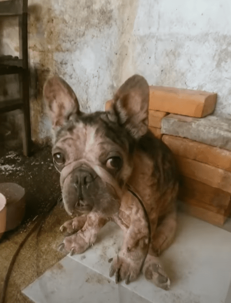 The haunting image of a small French Bulldog, its fur patchy and eyes filled with a raw, unsettling sadness, first…