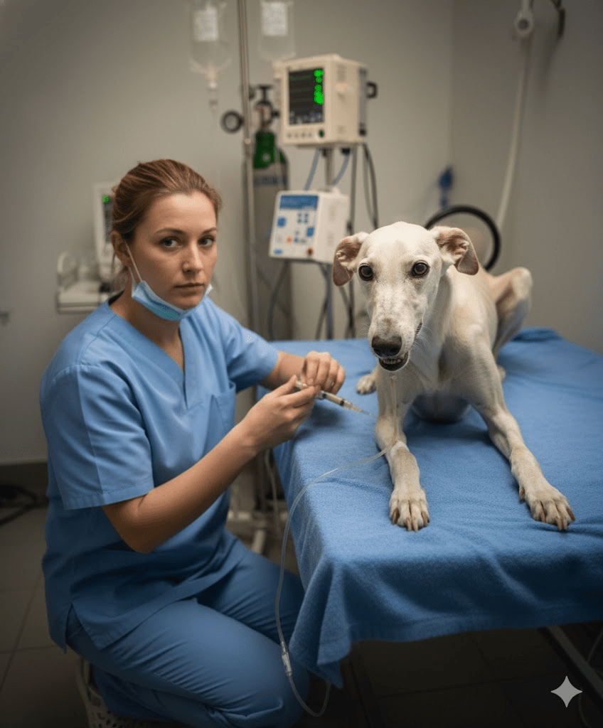 The emaciated form of a greyhound lay motionless on the cold examination table, a stark silhouette of bones beneath fragile…