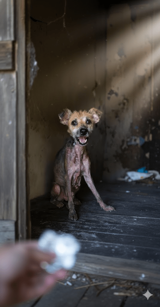 The image of a small, emaciated dog with patchy fur and a hopeful glint in its eyes tells a story…
