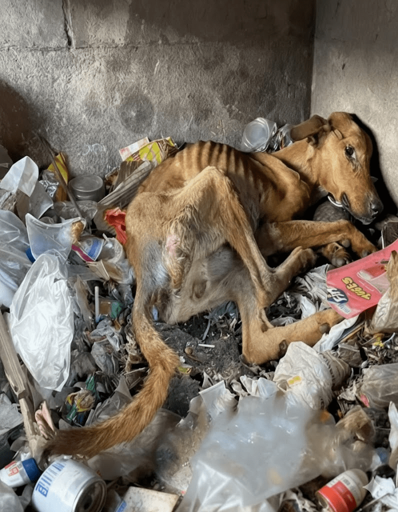 The image before us is a stark, heartbreaking tableau—a emaciated dog, its ribs tragically prominent, lies amidst a desolate pile…