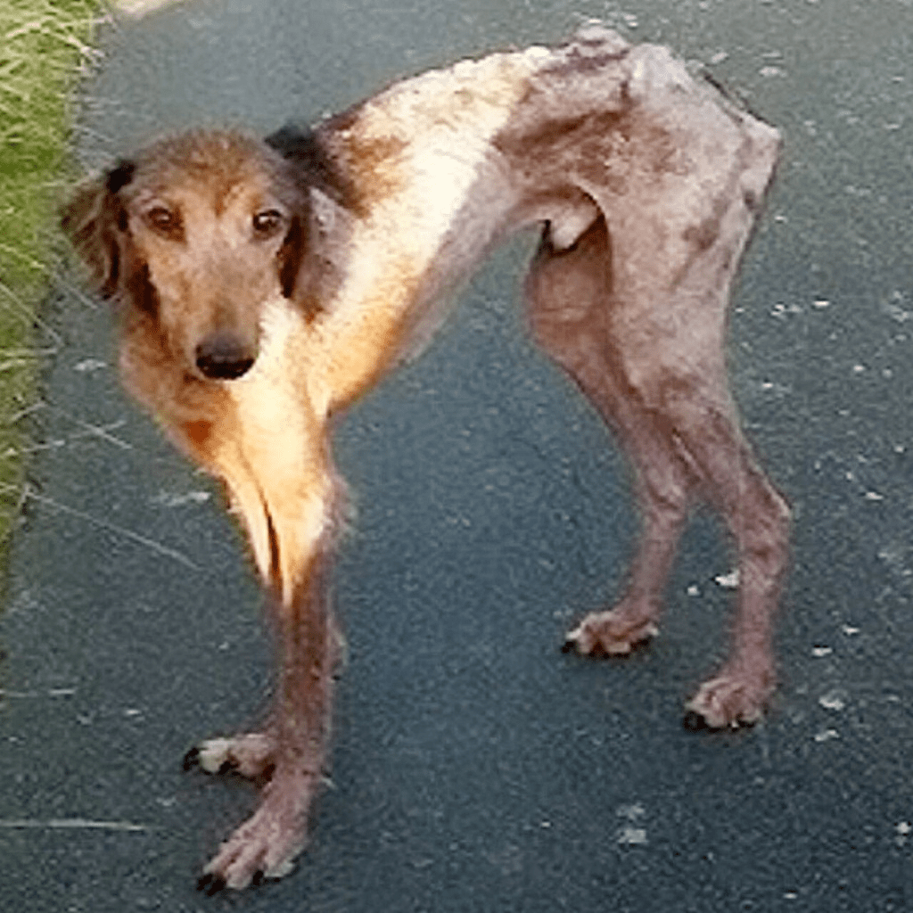 The image of Dylan, a Saluki dog, found emaciated and alone by the side of a road in Bridgend, UK,…