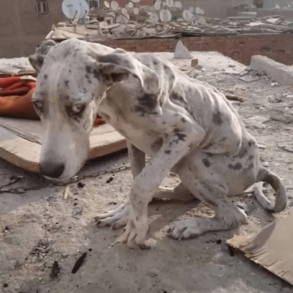 The image before you captures a moment of profound despair—a skeletal Great Dane, all ribs and haunted eyes, huddled on…