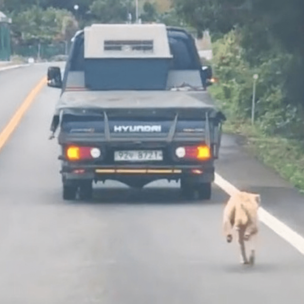 The image captures a scene that, at first glance, might seem ordinary: a dog running behind a truck on a…