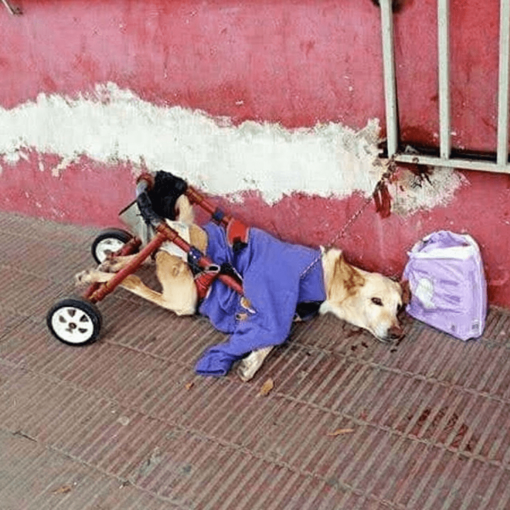 The image of Lunita, a golden-hued dog abandoned in a broken wheelchair on a cold sidewalk, tethered mercilessly to a…
