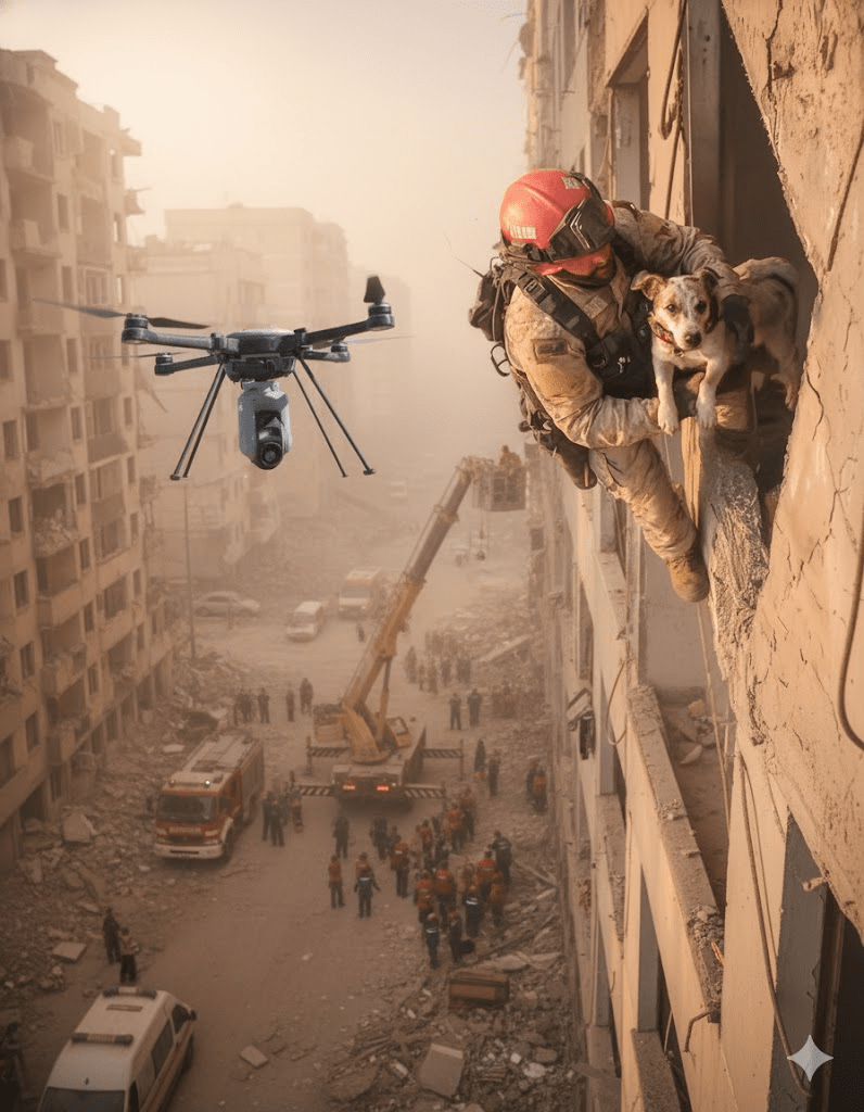 In the chaotic aftermath of what witnesses described as a sudden and devastating structural collapse in a bustling urban district, a harrowing rescue operation unfolded, captivating the world’s attention. Amidst the dust and debris, a single, compelling image emerged, symbolizing both the tragedy and the tenacious spirit of humanity and its loyal companions. The picture, seemingly snapped from a drone’s elevated perspective, captured a rescuer, helmeted and grim, carefully navigating precarious footing high above the ground, cradling a small, bewildered dog. This wasn’t just a simple animal rescue; it was a testament to the evolving dynamics of disaster response, where technology, courage, and an unexpected twist of fate converged to save a life that, by all accounts, should have been lost. The operation, initially hampered by unstable structures and the sheer scale of the destruction, saw a rapid deployment of specialized units, but it was the quiet hum of an aerial drone that would play an unexpectedly pivotal role in what would become a truly extraordinary rescue.