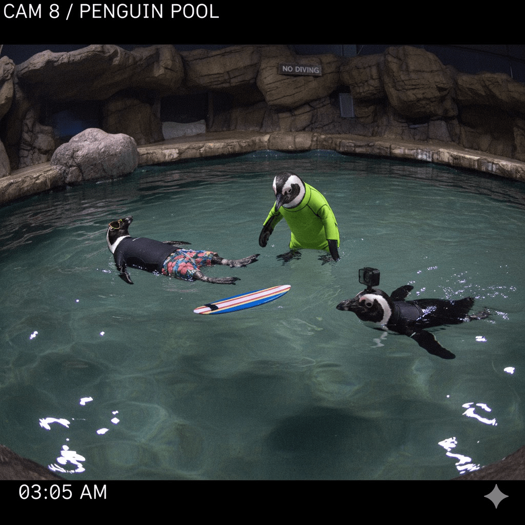 San Diego, CA – Early yesterday morning, staff at the San Diego Zoo’s beloved penguin exhibit arrived to a scene that was both bewildering and, in a strange way, undeniably charming. Security footage from “CAM 4 / PENGUIN” later revealed the unfolding of a truly unexpected event: an unauthorized overnight styling session that saw several of the zoo’s African penguins outfitted in miniature wetsuits, tiny sunglasses, and even custom-made board shorts. While all penguins were found safe and sound, the incident has left officials scratching their heads, local police investigating, and the internet captivated by what has quickly been dubbed the “Penguin Surf Break.” The audacious act has sparked a flurry of theories and a global conversation about the whimsical side of wildlife encounters, leaving many to wonder about the motives behind such an elaborate and harmless, yet still illicit, escapade.