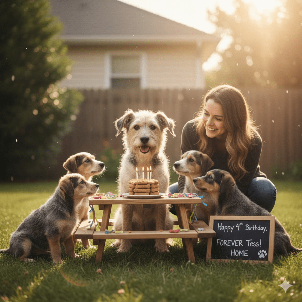 As the puppies grew, each found a loving home. Yet, Tess remained, a quiet presence that had woven itself into the fabric of Jessica and Mark’s lives. They had initially planned to only foster, but Tess’s gentle demeanor and unwavering loyalty had captured their hearts entirely. The biggest twist of all was realizing that their “temporary” guest was already home. On her fourth birthday, surrounded by her adopted family, Tess, the muddy survivor, finally found the forever love she deserved.