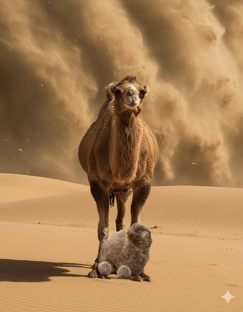 A Storm on the Horizon and a Mother’s Instinct Our journey began uneventfully, tracking a small herd of wild Bactrian camels across the Mongolian Gobi. The sky, a brilliant azure, offered no hint of the drama that was about to unfold. We had spotted a new mother and her calf, barely a few days old, its fluffy coat a striking contrast against the ochre dunes. Suddenly, the wind shifted, carrying with it the unmistakable scent of an approaching sandstorm. The sky turned an ominous brown, and the air grew heavy with anticipation. The mother, sensing the impending danger, began to nudge her calf, urging it towards the sparse shelter of a rocky outcrop. Her usual placid demeanor was replaced with an urgency we had never witnessed. We watched, captivated, as she positioned herself strategically, shielding her tiny offspring with her massive body, a living fortress against the elements. It was a poignant display of maternal instinct, a powerful reminder of the raw, untamed beauty of nature’s protective embrace.