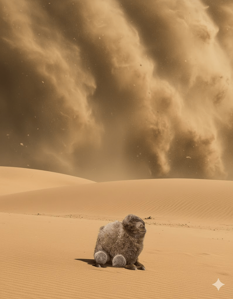 Separation in the Swirl As the sandstorm intensified, visibility plummeted to mere feet. The roar of the wind, laden with abrasive sand, was deafening. We hunkered down, our equipment lashed securely, hoping the storm would pass quickly. When the winds finally subsided, hours later, the landscape was transformed, dunes shifted, and familiar landmarks vanished. Our immediate concern was the mother and calf. We began a slow, careful search, our hearts sinking with each empty stretch of sand. Then, a faint cry, carried on the lingering breeze, reached our ears. It was the calf, but alone, huddled beside a newly formed dune, its fluffy coat matted with sand, and its serious expression now tinged with undeniable distress. The mother was nowhere in sight. The storm, in its brutal indifference, had torn them apart. The desert, which had just showcased a mother’s fierce protection, had now dealt a cruel blow.