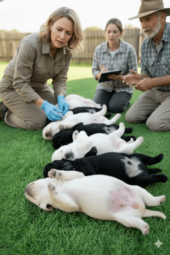 In a quiet corner of a sprawling rural property, under the gentle caress of the morning sun, a scene of unparalleled cuteness and baffling intrigue unfolded. What began as a routine check of the grounds by a local farmer, Mr. Elias Thorne, quickly transcended the mundane. Nestled amongst the dew-kissed blades of grass, a perplexing arrangement of newborn Labrador puppies lay, bellies skyward, in what appeared to be a perfectly synchronized slumber. Their tiny forms, a mix of creamy white and deep ebony, were intertwined in an almost artistic helix, hinting at a story far more complex than a simple litter. Elias, a man whose life was dictated by the predictable rhythms of agriculture, found himself utterly unprepared for this tableau. His initial shock gave way to a burgeoning curiosity; these weren’t his dogs, nor had any of his neighbors reported a missing mother. The air, usually filled with the sounds of chirping birds and distant tractors, now seemed to hum with an unspoken question: how did these adorable bundles of joy come to be here, in such an unusual, almost deliberate, formation? The mystery had just begun to unfurl its first thread.