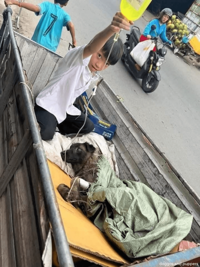 The merciless midday sun beat down on the busy, dusty road, but inside the small, open-backed truck, a scene of profound compassion was unfolding. A young boy, perhaps no older than eleven, sat protectively next to a large, clearly ailing dog, its dark fur matted and its eyes heavy with exhaustion. The dog lay on a makeshift bed of blankets and cardboard, covered by a rough, green tarpaulin. With a steady hand that belied his age, the boy held a translucent yellow intravenous drip bag high above his head, the tube running down to a cannula carefully taped into the dog’s foreleg. This was not a veterinary clinic; this was an emergency lifeline on wheels, a desperate attempt to save a life amidst the chaotic flow of traffic. The image was a powerful juxtaposition: the mundane backdrop of daily street life—a motorbike zipping by, a vendor’s coconuts stacked on the curb—against the extraordinary act of dedication playing out in the truck bed. This wasn’t just a simple rescue; it was the middle chapter of a story filled with unexpected twists, a narrative where a boy’s swift, determined action became the only hope for a stray dog facing the direst circumstances.