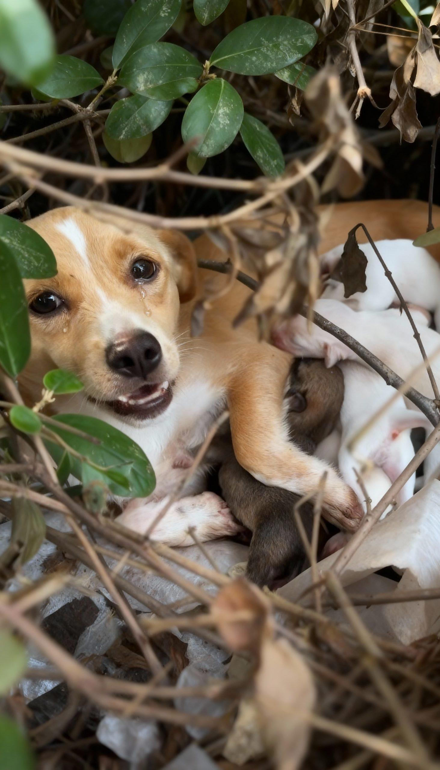 In the quiet outskirts of a small town, nestled beneath a tangle of overgrown bushes and brittle branches, Luna lay with her newborn puppies. The photograph captured a fleeting moment of her life—a life marked by struggle, instinct, and an unwavering maternal love. Her tan and white fur was matted with dirt, her eyes glistening with a mix of exhaustion and determination as she guarded her litter. This was no ordinary dog; this was Luna, a stray who had become an unlikely hero in a world that often overlooked her kind.